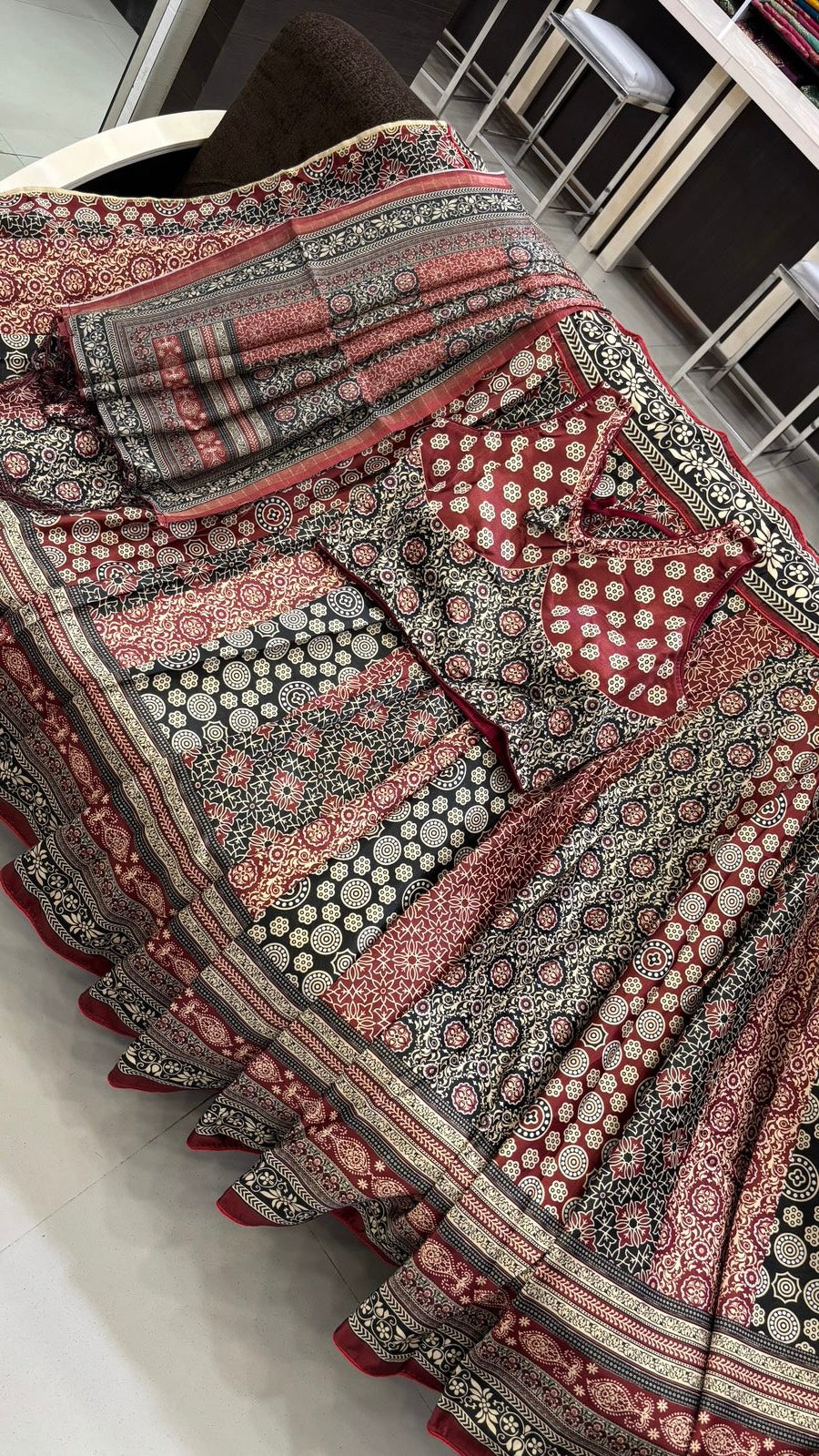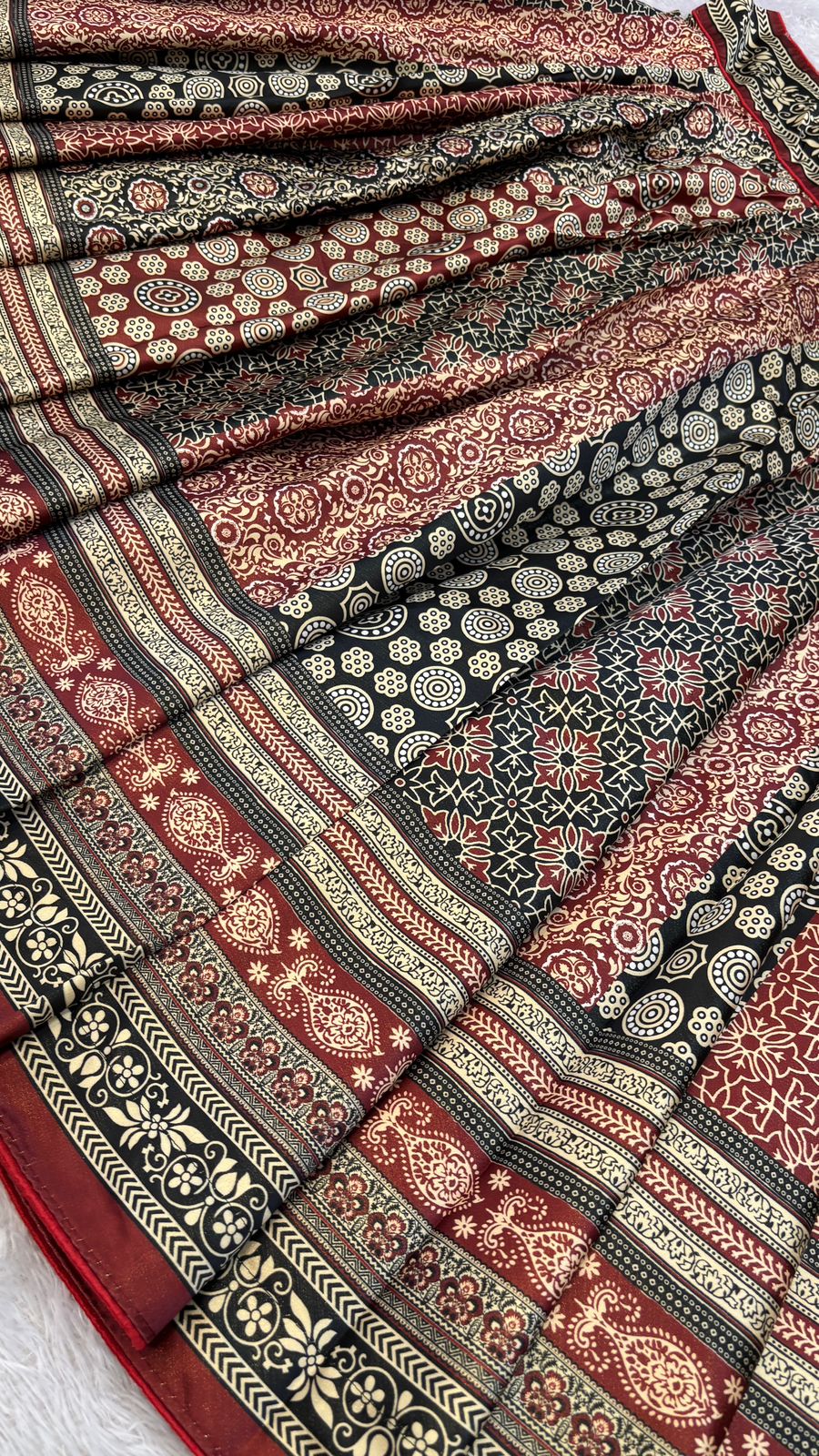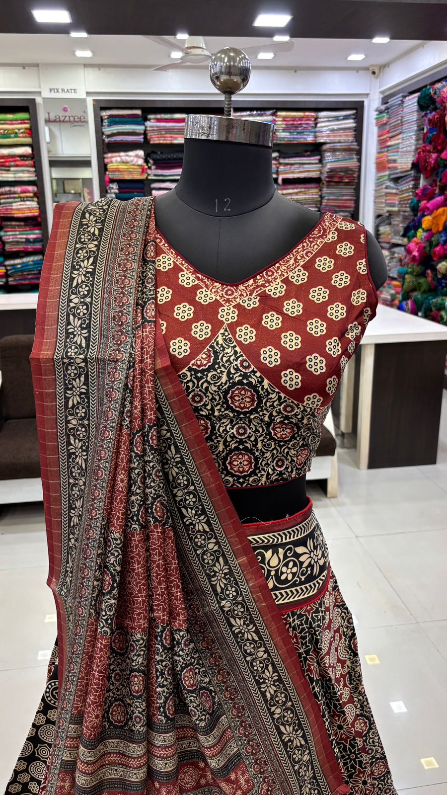 This Lehanga Choli is a celebration of heritage and contemporary style. From the intricate Ajrakh design on the lehanga to the convenience of a ready-made blouse and the playful tussles on the dupatta, it's crafted to be a stunning and versatile choice for a range of celebratory occasions.