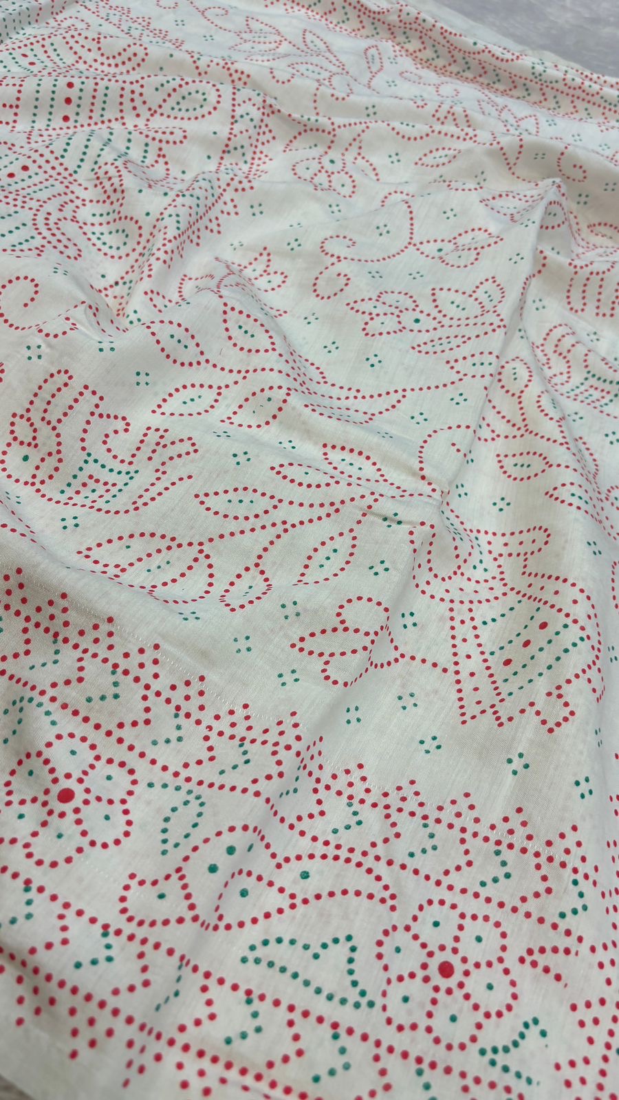 Design: Featuring the Khadi Chandrani Bandhani design, the dupatta boasts vibrant prints that are both eye-catching and culturally significant. The bandhani pattern adds a touch of authenticity and charm.