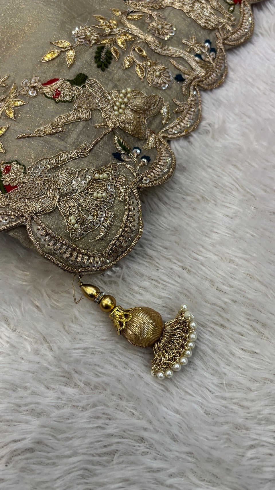 Presenting the “Shaan E Hindustan” collection, a showcase of timeless elegance and intricate craftsmanship. Each saree in this collection is crafted from luxurious organza material, known for its lightweight yet lustrous finish, perfect for any grand occasion. The saree features exquisite handwork detailing, reflecting the artistry and dedication of skilled craftsmen.