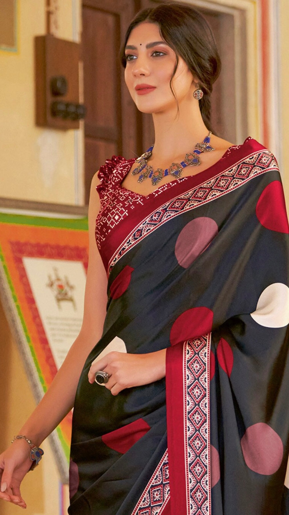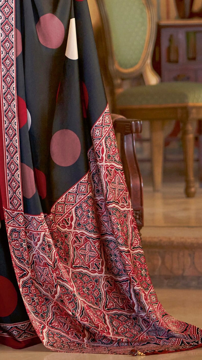 2. Ajrakh Print Design: Adorned with intricate Ajrakh prints, this saree showcases traditional Indian craftsmanship, featuring intricate patterns and vibrant hues that add a touch of cultural charm.