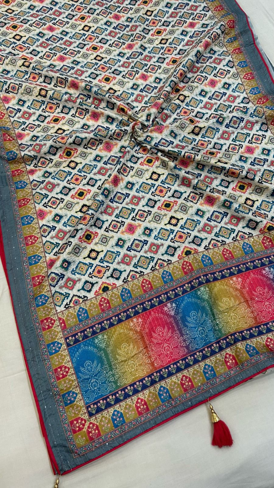 Elevate your style with our exquisite Digital Print Saree adorned with delicate sequence work, crafted in luxurious Kora Silk. Priced at just ₹1090, this saree seamlessly merges the modern allure of digital print with the timeless elegance of sequence work, all in a beautiful white design.