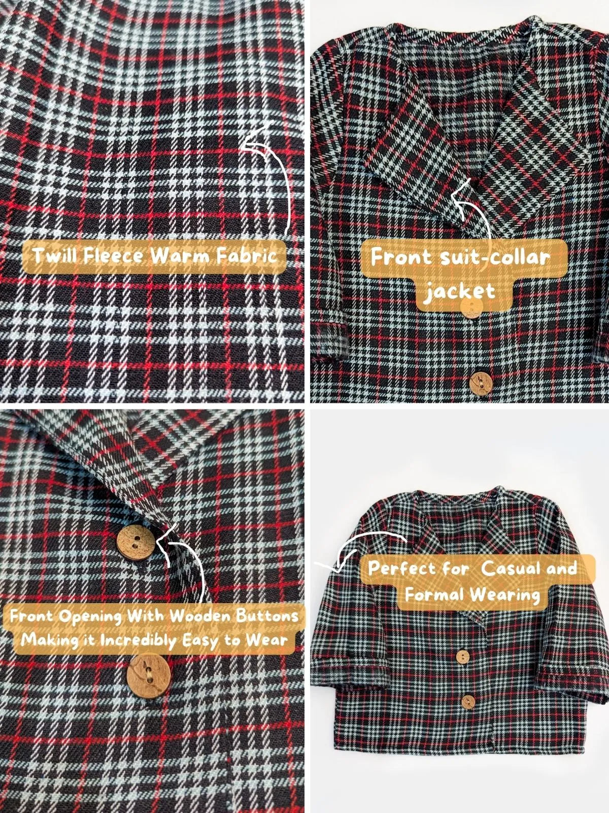 Our adorable baby boys' jacket, a perfect blend of style and warmth. Made from cozy checks with a touch of fleeced fabric, this tiny wonder is perfect for layering over shirts and making a statement at parties. Full Sleeves give warmth during winters and travelling.
