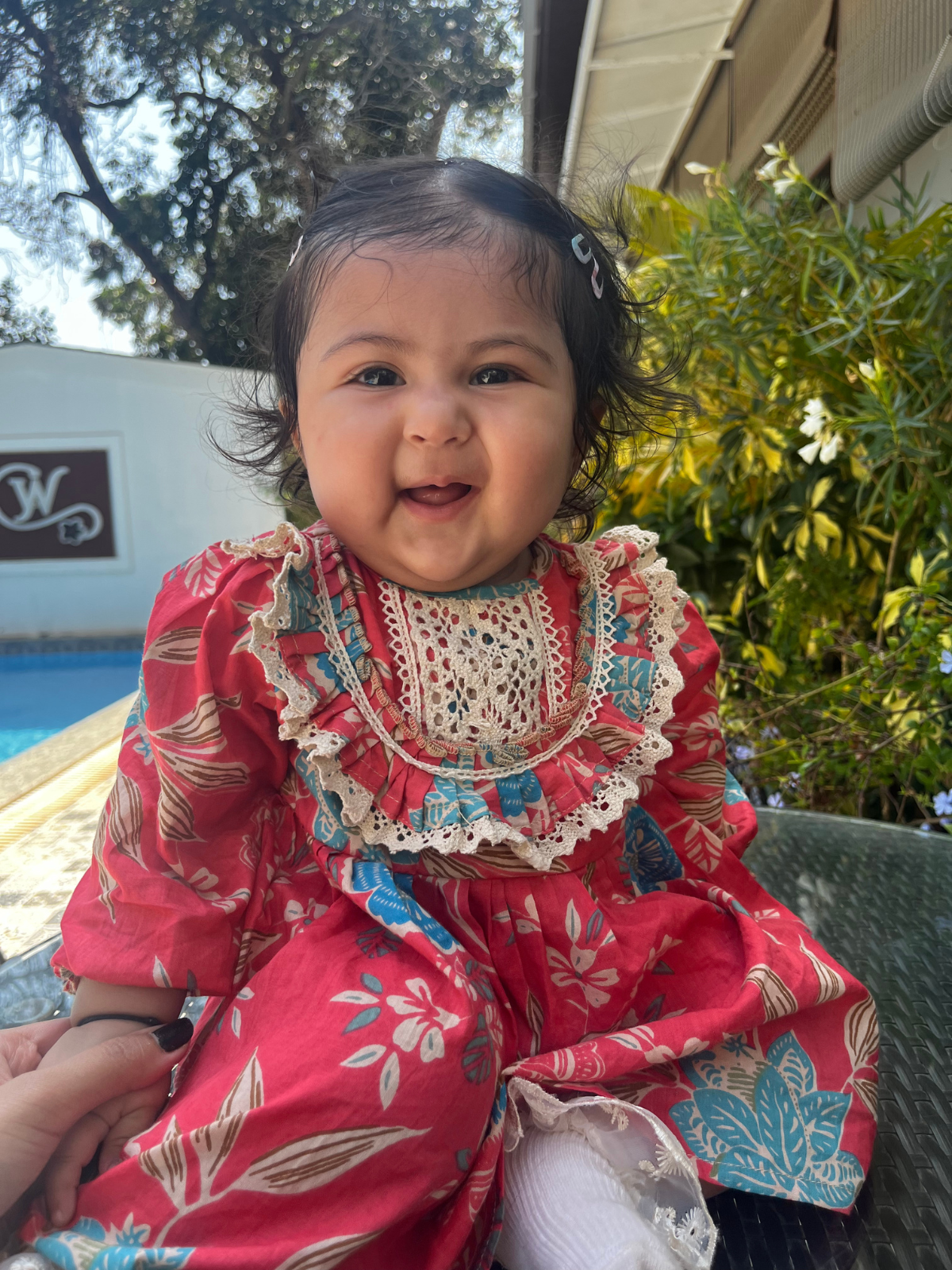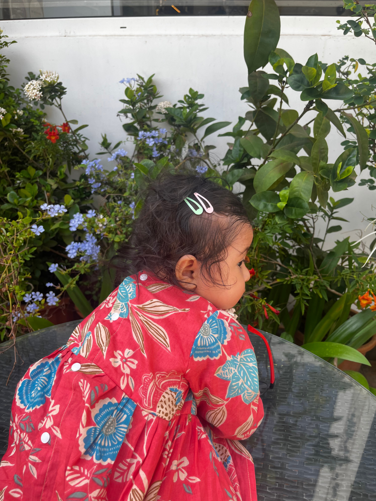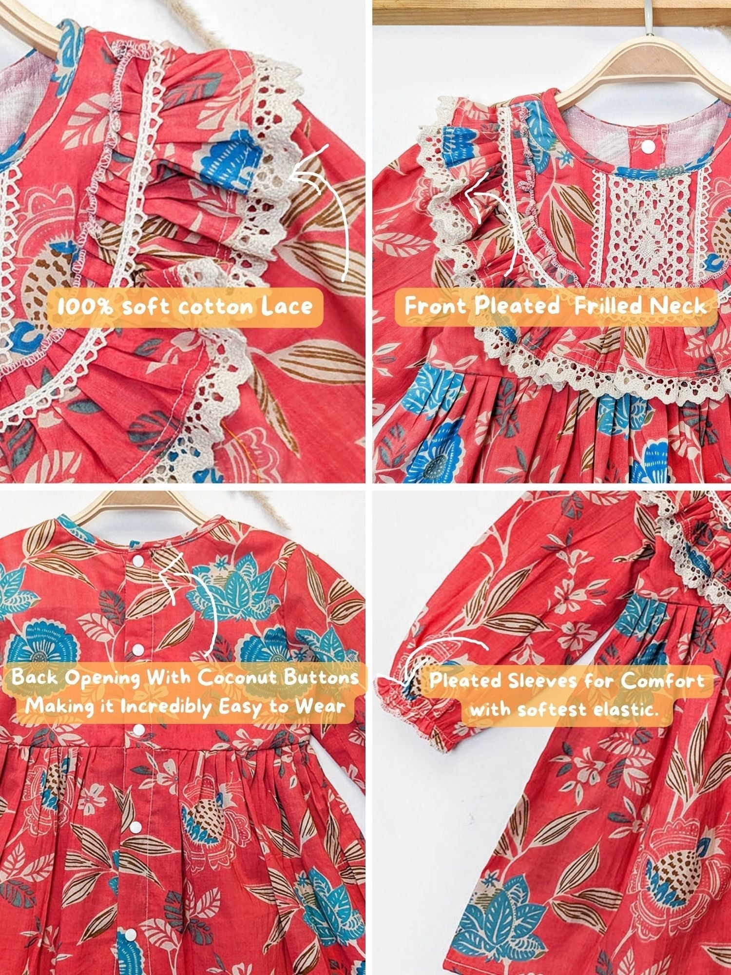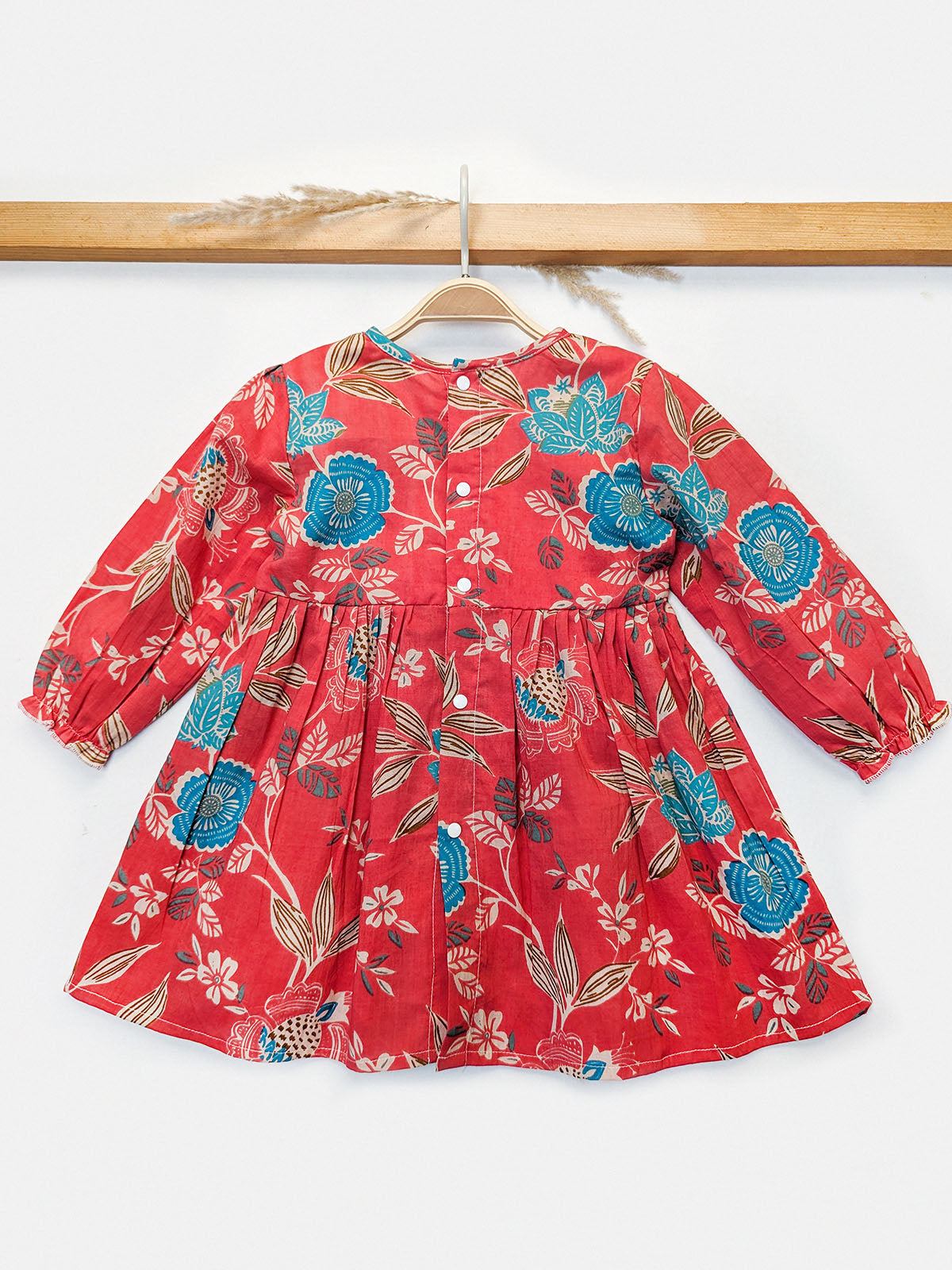 Halemons Baby Girl Cotton Full Sleeves Pleated Neckline Dress-Red