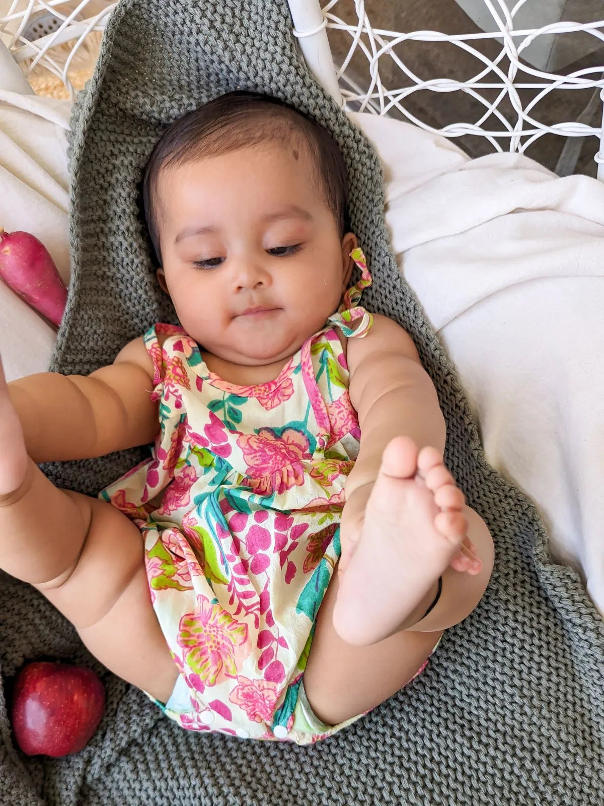 This romper features a tiny yoke for a bit of flair and a baggy body that gives lots of room to move.