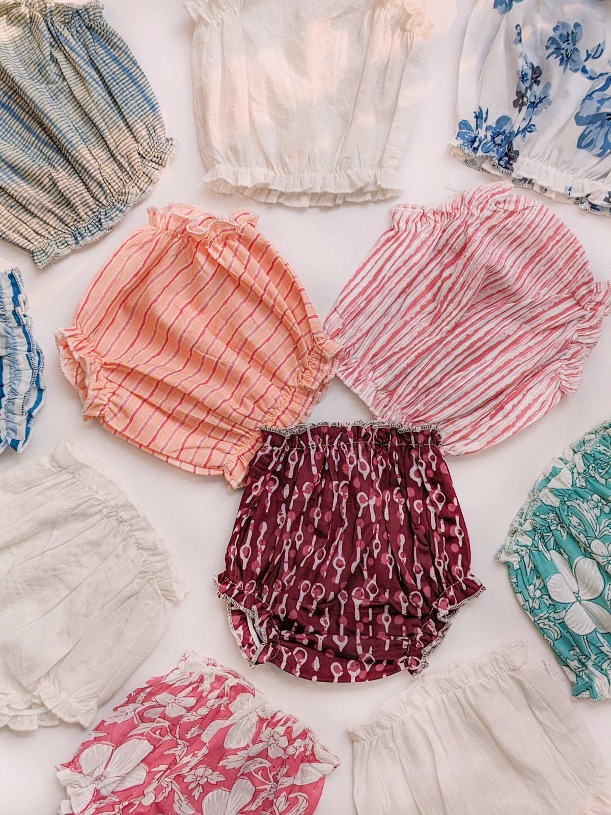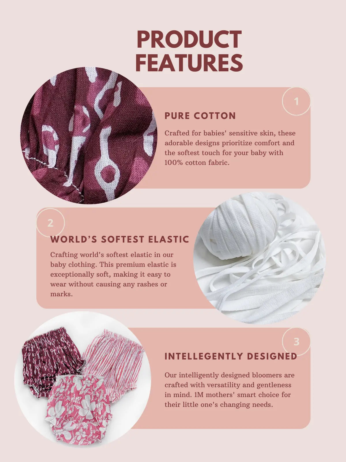 Supersoft fancy bloomers for kids! The soft 100% cotton fabric is super comfortable, highly breathable and master of sweat absorption. We care for your babies' skin so No scratchy tags - only smooth seams and gentle elastics.