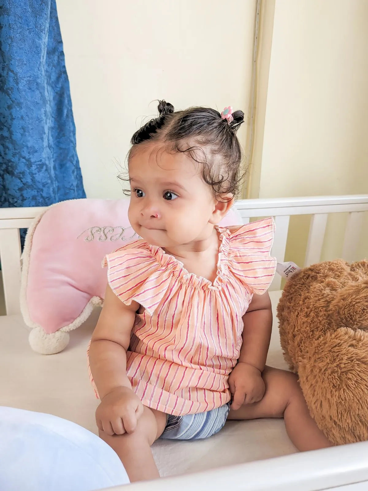 "Summer Tulip" - a pack of three 100% cotton outfits designed specifically for baby girls. These adorable ensembles feature cute frilled shoulders attached as gathered raglan sleeves, adding a playful pattern to the design. Whether worn alone for 0-3 months or paired with our soft gathered bloomers for 3-12 months, this mid-thigh length style is simply irresistible. Crafted with utmost care and attention to detail, "Tiny Tulip" offers the same softness, breathability, and high-quality features as our other baby girls' clothing. Trust in the comfort, cuteness, and delightful pattern of "Summer Tulip" to dress your little princess in style.
