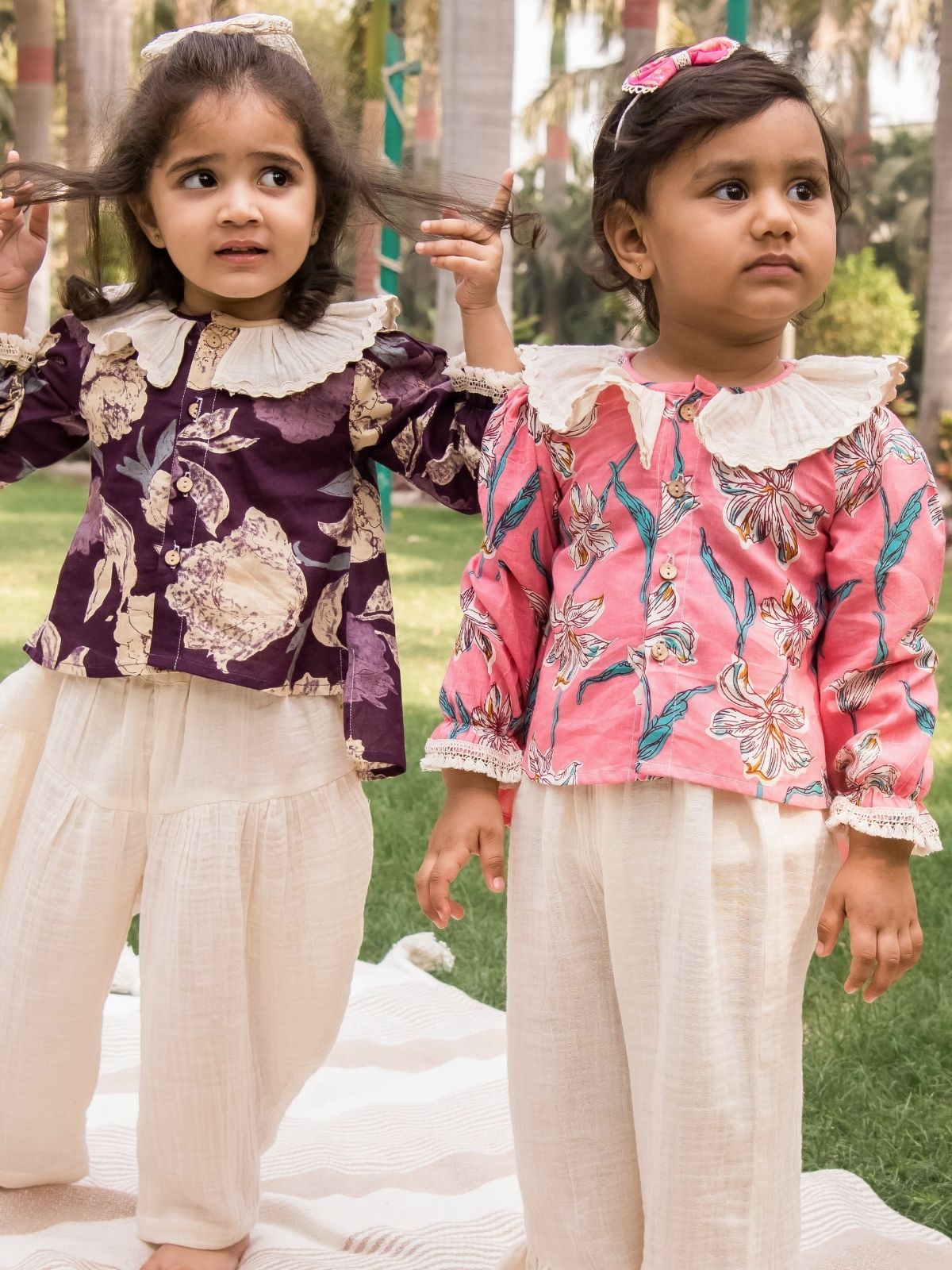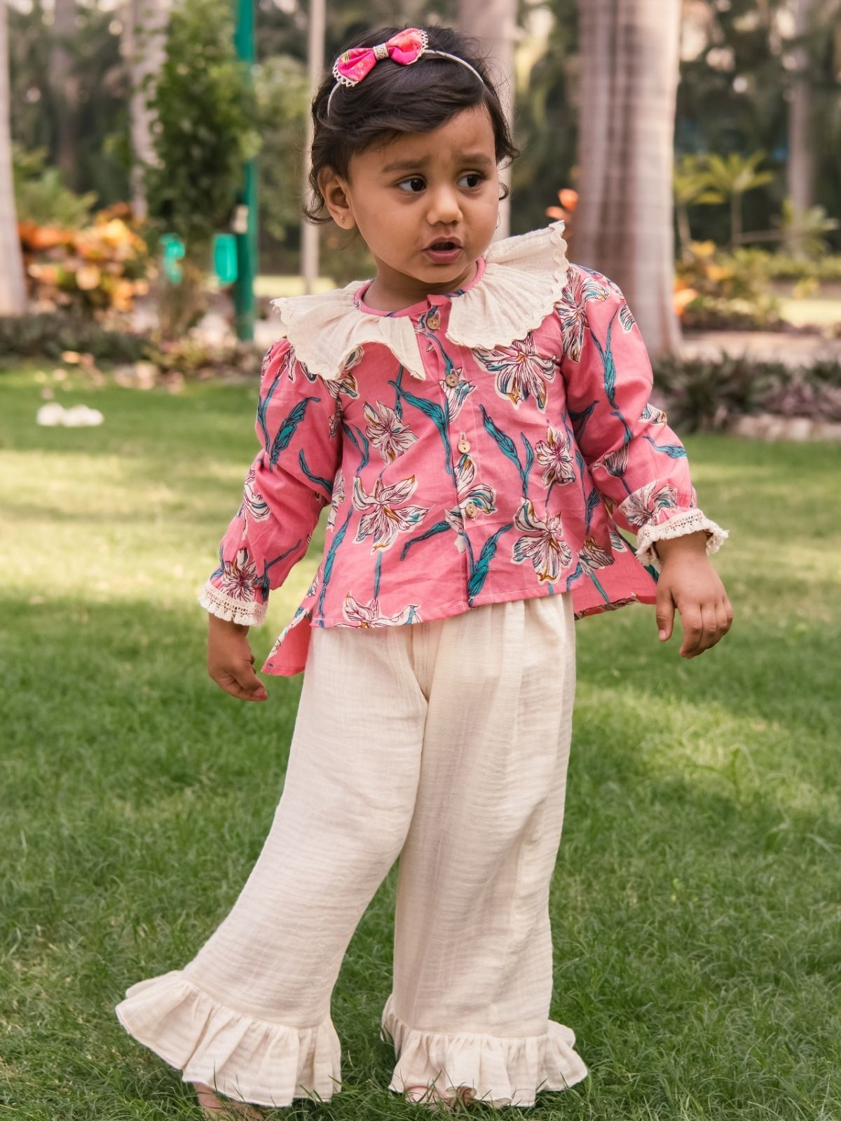 Top: Lightweight Floral top has Full sleeves, a Frilled Collar, and a flowy fit perfect for all weather.