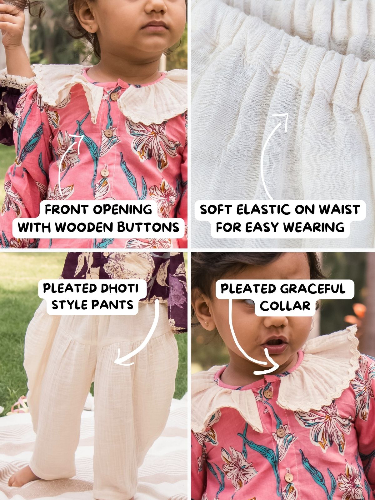 Bottom: Soft, breathable Cream muslin Dhoti Pants has elastic waistband for easy wearing and comfort.