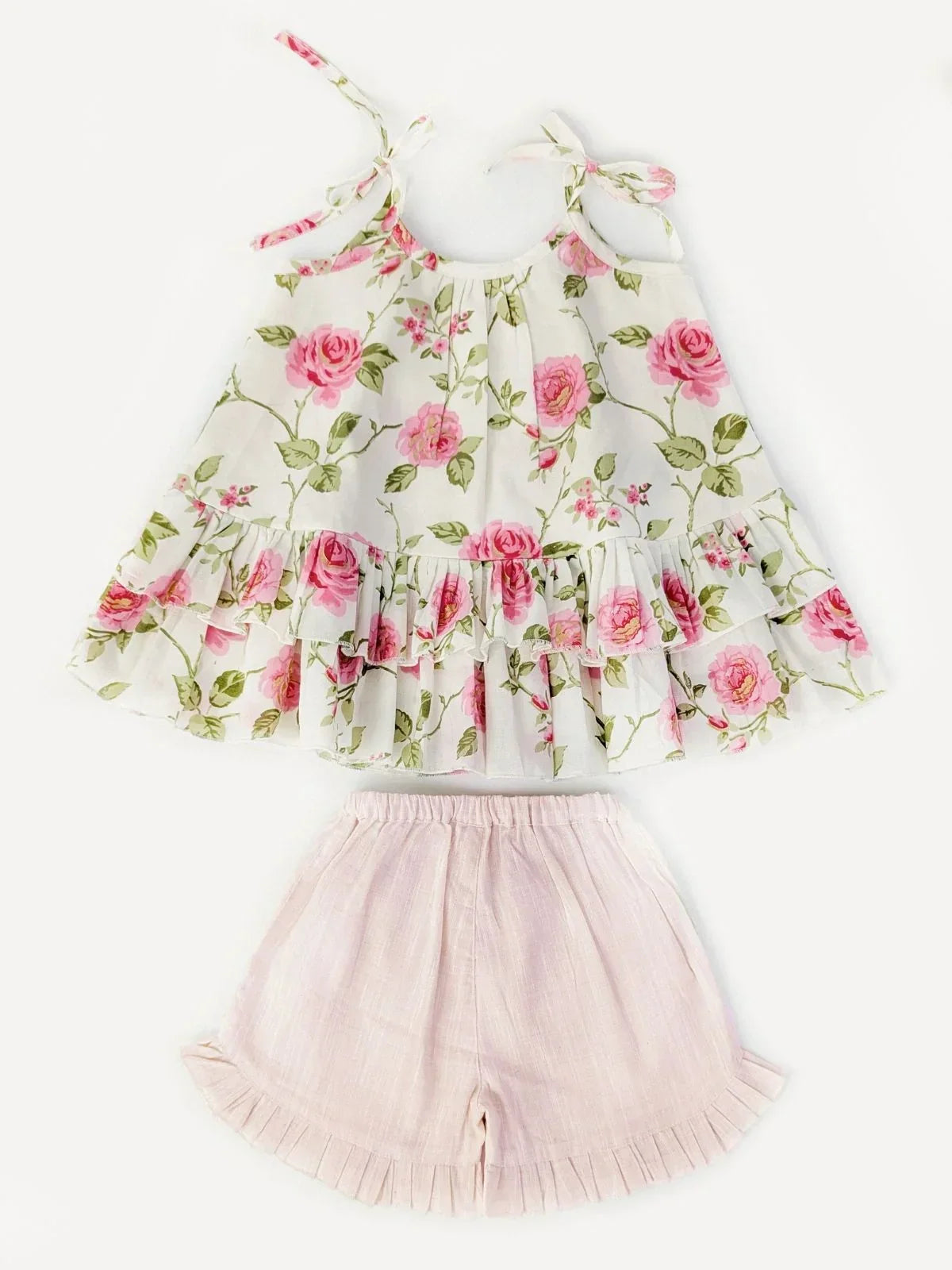 Creamy Rose Ruffled Cotton Summer Top Bottom Set