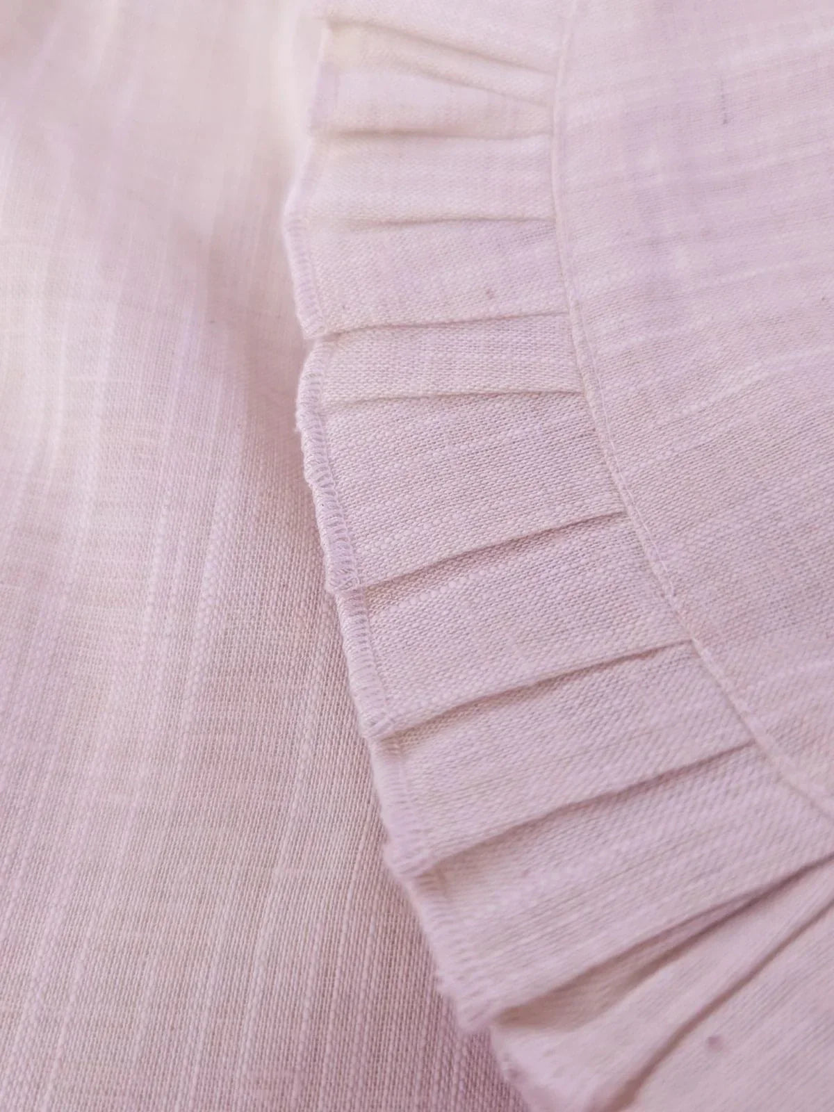 Bottom: Soft, breathable baby pink subtle pleated ruffle short pants is frilled and has elastic waistband for easy wearing and comfort.