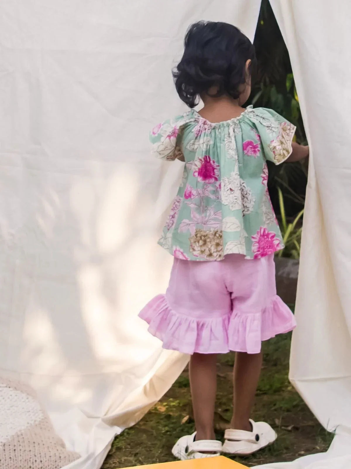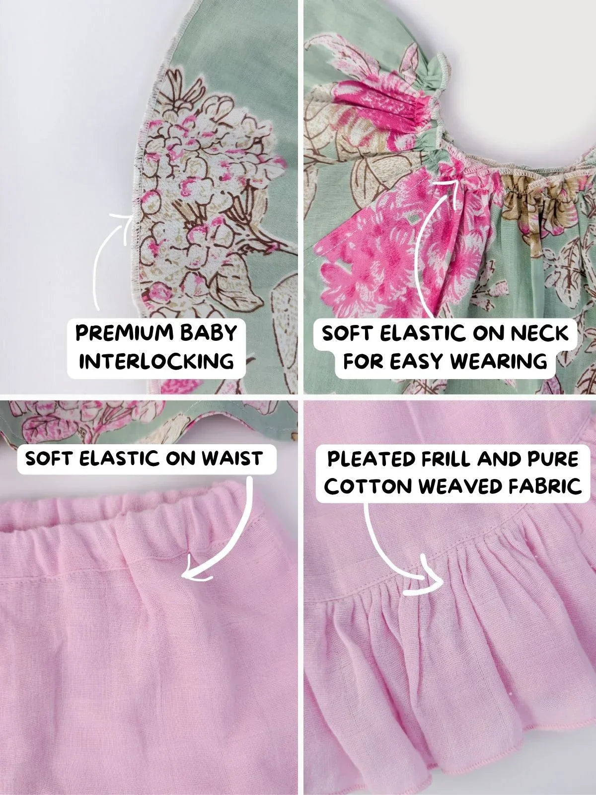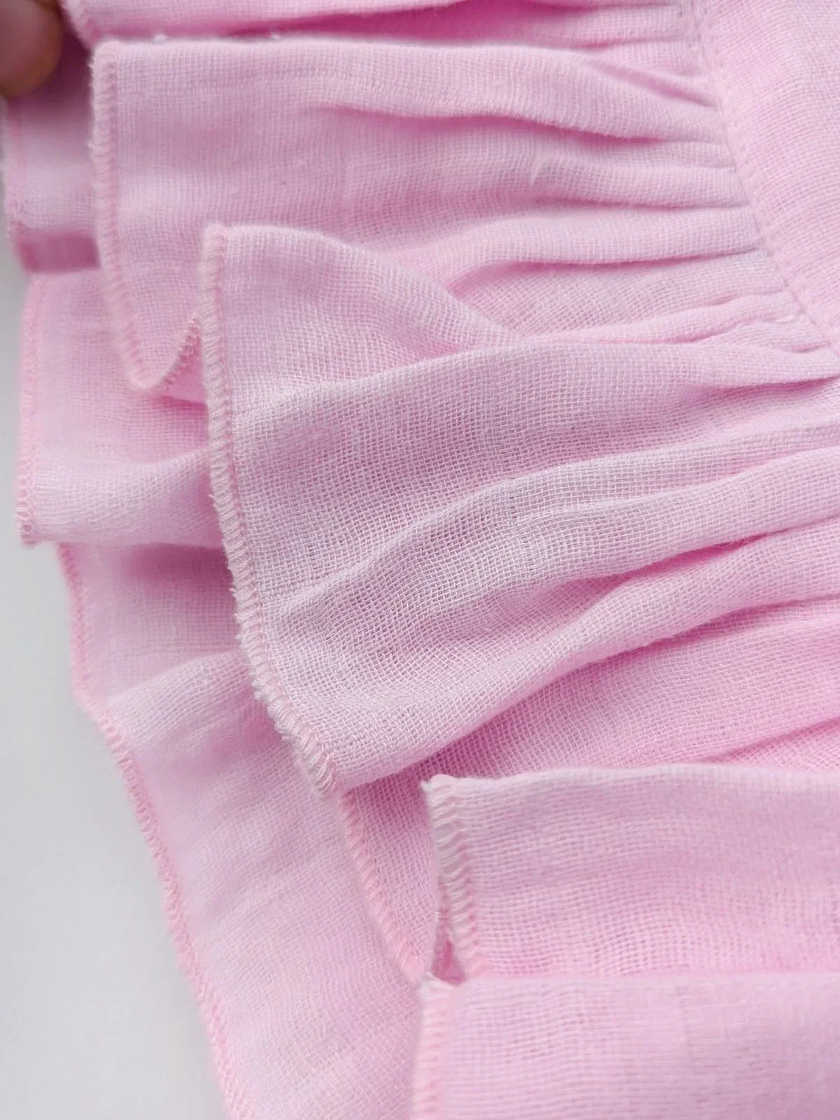Bottom: Soft, breathable pink, muslin ruffled short pants has elastic waistband for easy wearing and comfort.