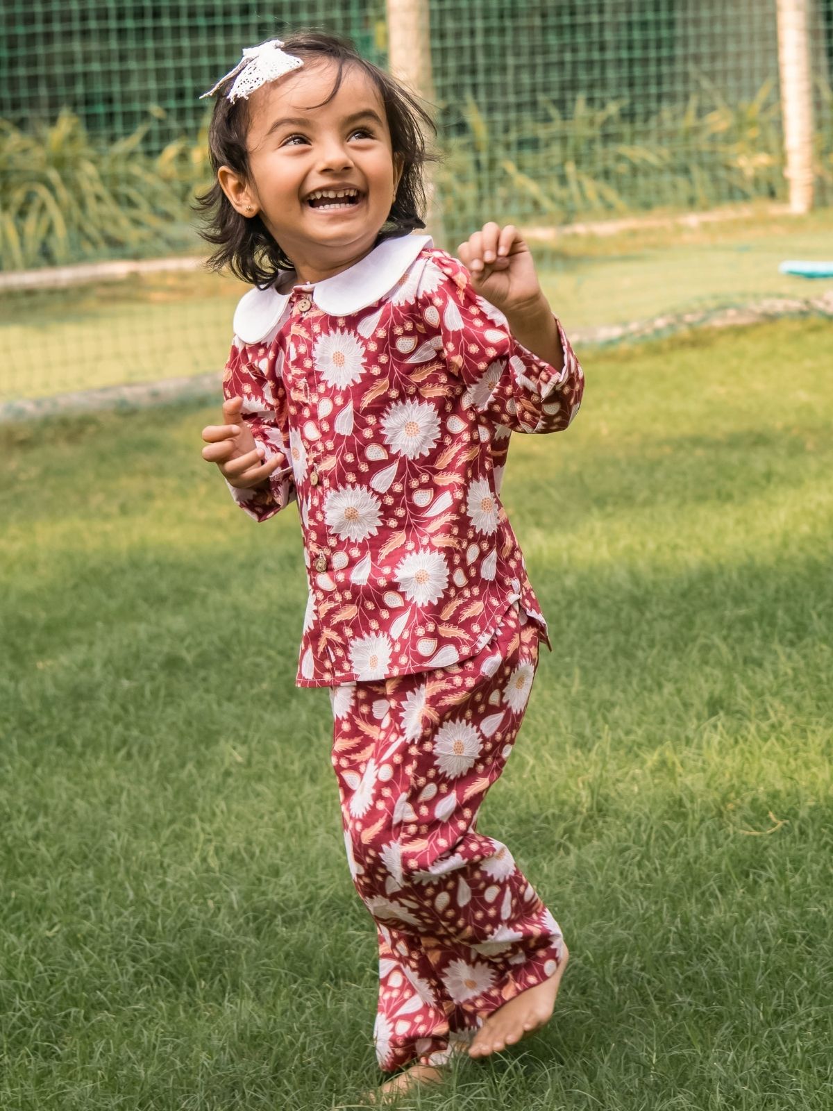 Bottom: Soft, breathable red floral cotton straight-fit pants has elastic waistband for easy wearing and comfort.