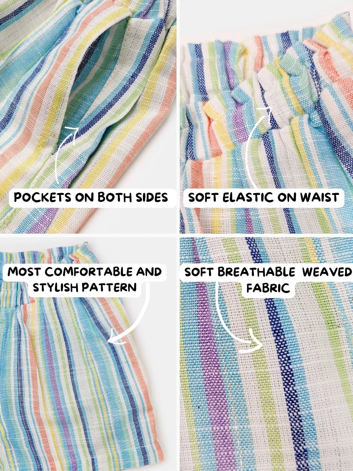 Discover the charm of comfort and sustainability with our Unisex Kids' Khadi Cotton Half Pants. Made with 100% soft khadi cotton, these Ocean Multi colour Stripe breathable and lightweight pants ensure all-day comfort. Designed with practical side pockets and playful stripes, they are ideal for any child's active day. Sustainable and gentle on the skin, our khadi pants are a smart choice for parents who value comfort and sustainability.
