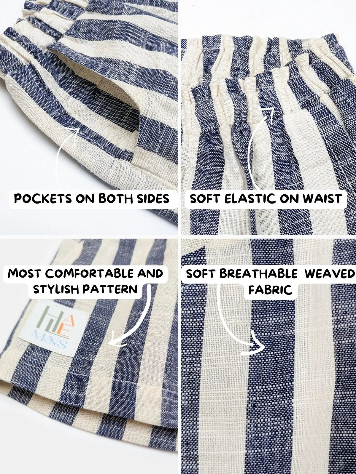Discover the charm of comfort and sustainability with our Unisex Kids' Khadi Cotton Half Pants. Made with 100% soft khadi cotton, these Blue Stripe breathable and lightweight pants ensure all-day comfort. Designed with practical side pockets and playful stripes, they are ideal for any child's active day. Sustainable and gentle on the skin, our khadi pants are a smart choice for parents who value comfort and sustainability.