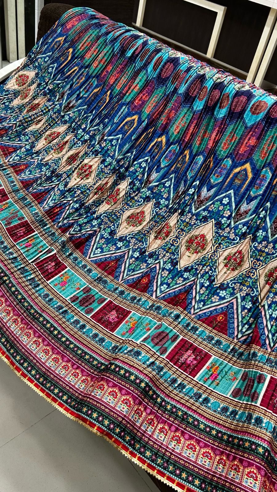 The Lehanga Choli you're describing is a captivating ensemble, meticulously crafted for special occasions like Navaratri, weddings, and other festive celebrations.