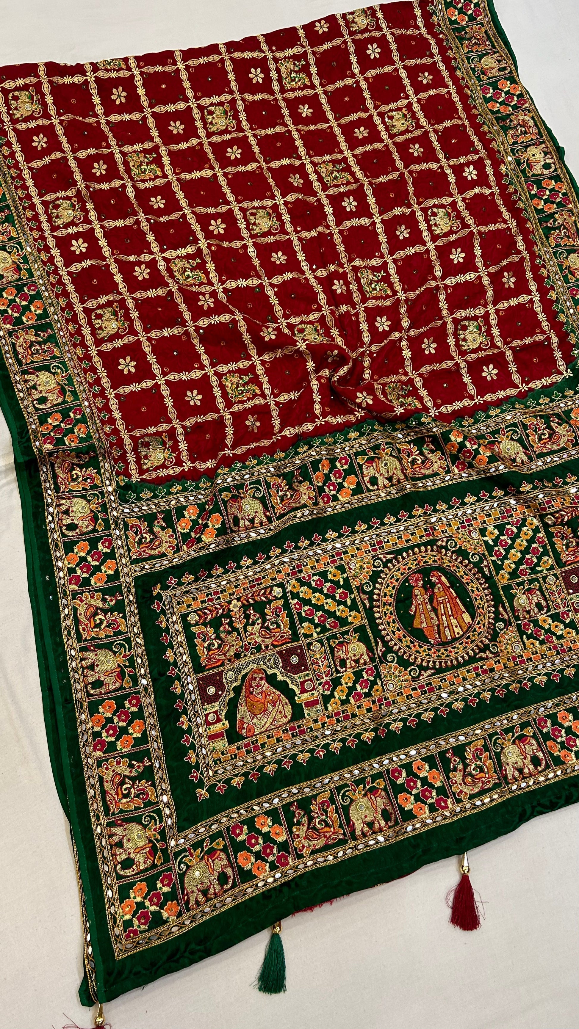 Step into the vibrancy of tradition with our Kutchi Gharchola Saree, a captivating blend of artistry and cultural symbolism. Crafted with precision, the saree narrates tales of heritage through intricate embroidery and timeless design.