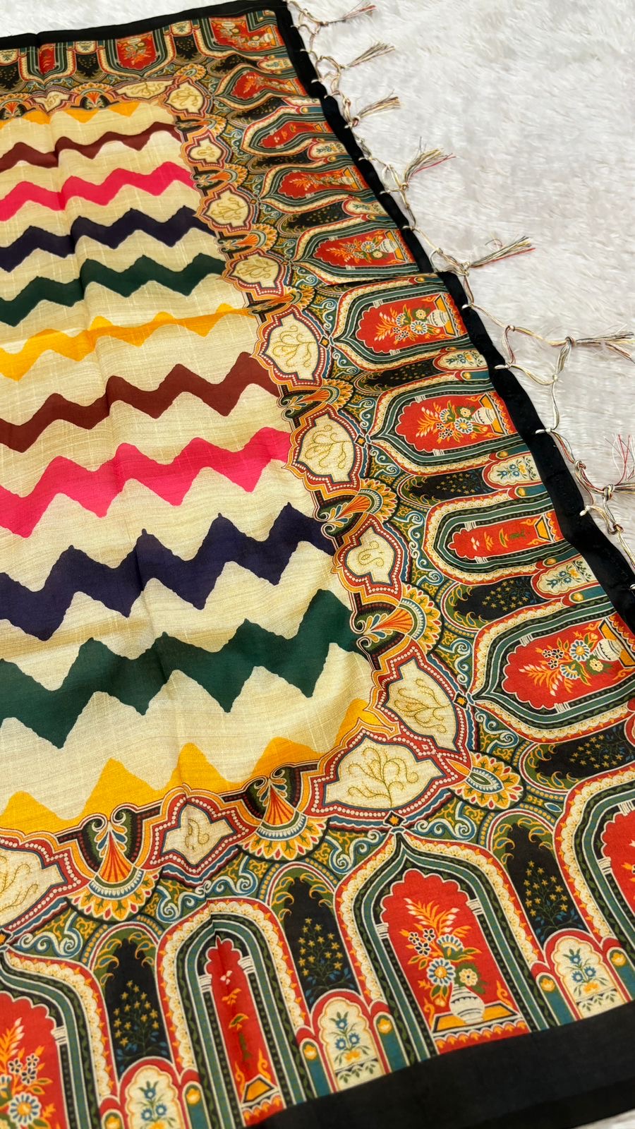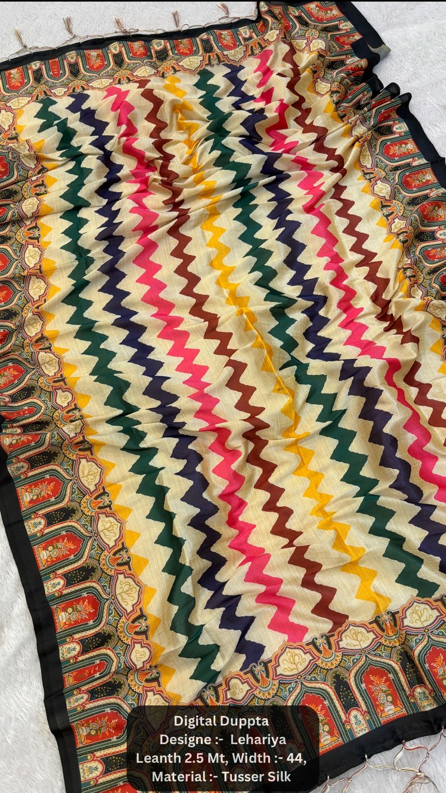 "Order now: Stylish Tusser Silk dupatta with vibrant digital print for ₹450. Perfect for adding a contemporary touch to lehengas, salwar kameez, and sarees."