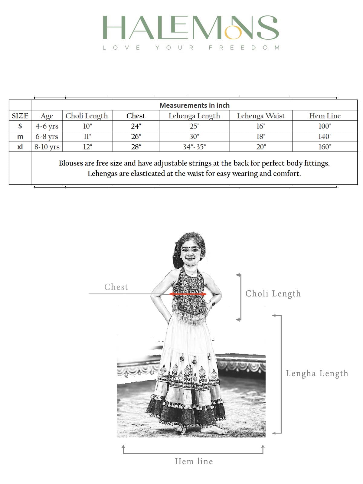 Lehenga - A harmonised multi colour two layered lehenga is definatley going to make you girl look trendy. Aari style traditional embroidery are used to decorate the lehenga. The lehenga is attached with handmade latkan and elasticated on waist for easy wearing and comfort.