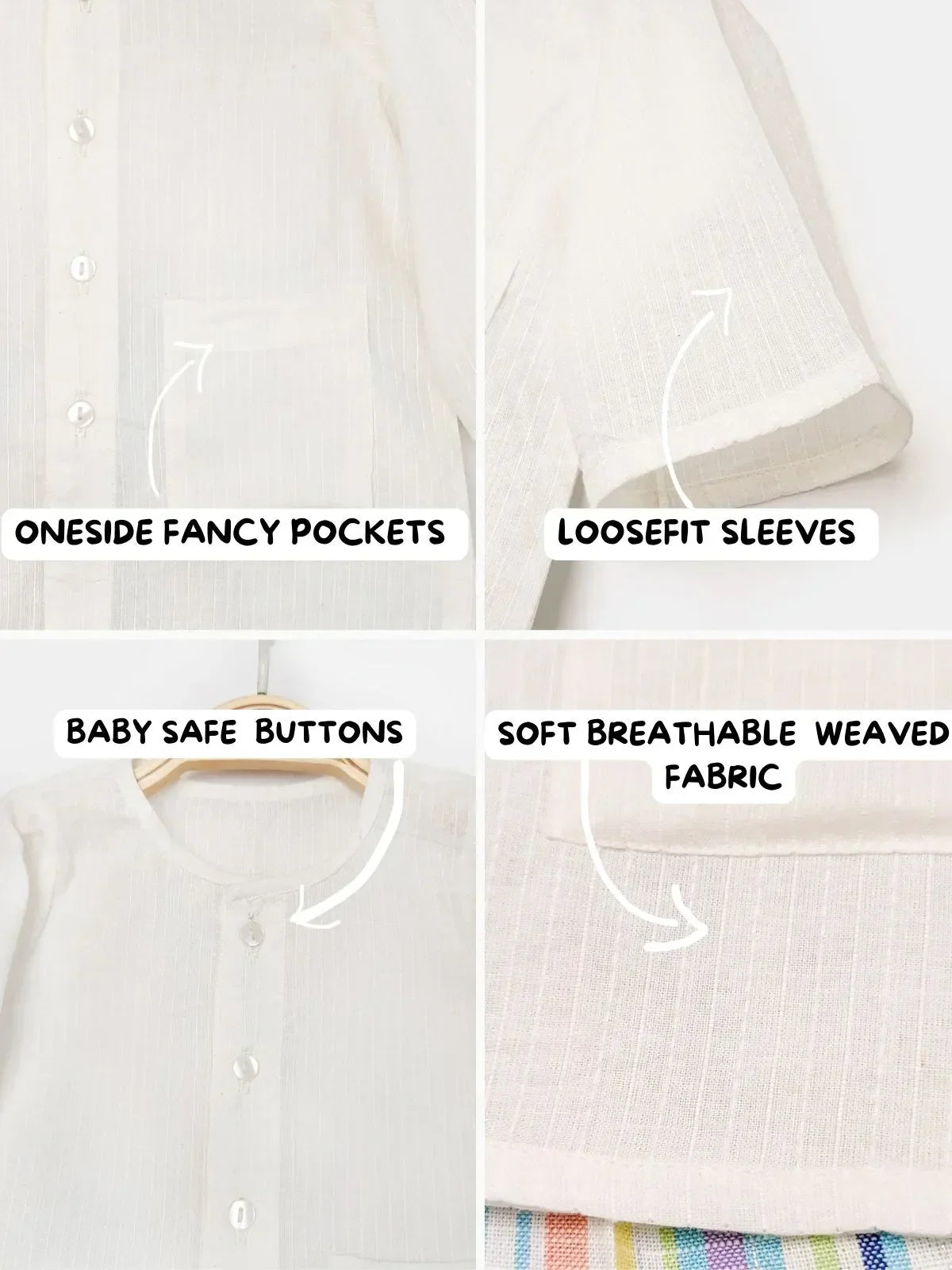 TOP : Sustainable and gentle on the skin, This kantha white top have front opening and fastened with water buttons. There is a cute side pocket on one side. They are a smart choice for parents who value comfort and sustainability.