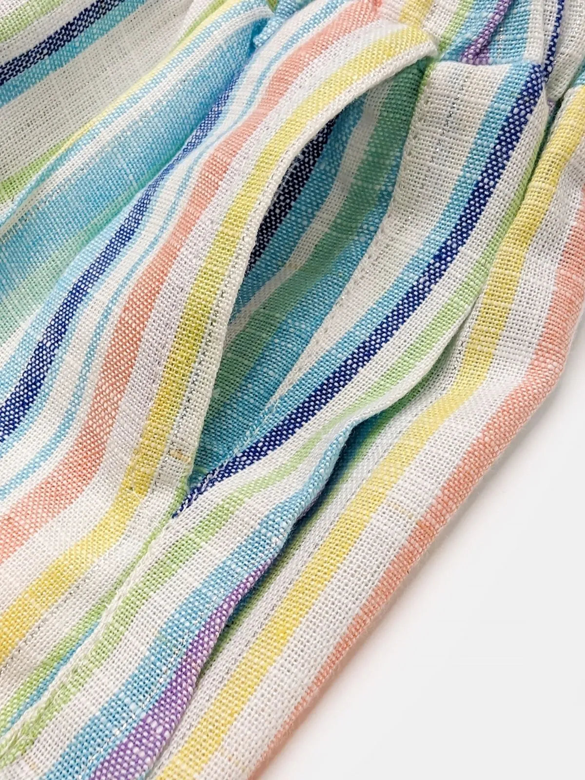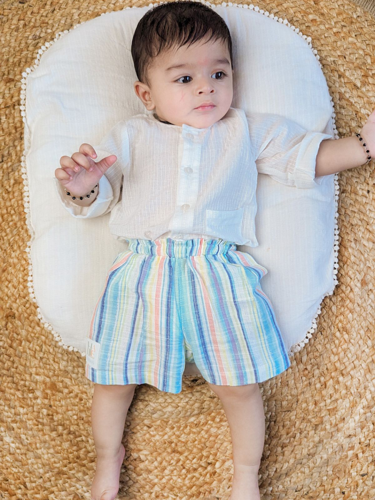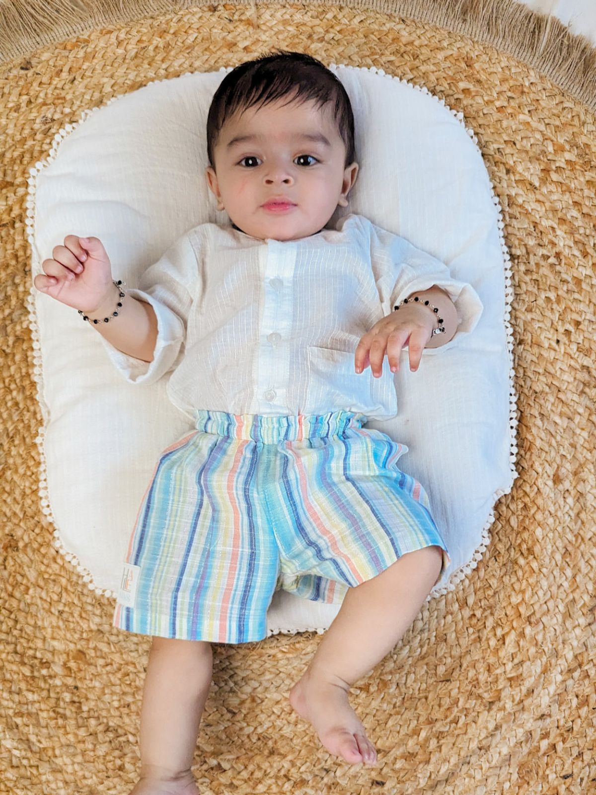 BOTTOM : Made with 100% soft khadi cotton, these Ocean multi stripe breathable and lightweight knee length pants ensure all-day comfort. Designed with practical side pockets and playful stripes, they are ideal for any child's active day.