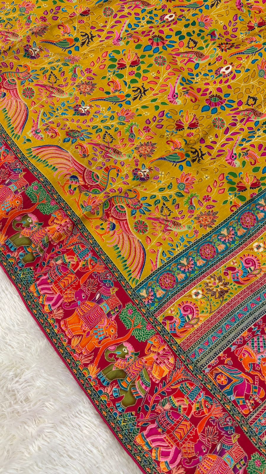 "Draped in resplendent colors reminiscent of royal courts, this exquisite handwoven saree bears the hallmark of Rajwadi grandeur, with intricate motifs and luxurious fabrics weaving together a tapestry of majestic elegance fit for a queen."