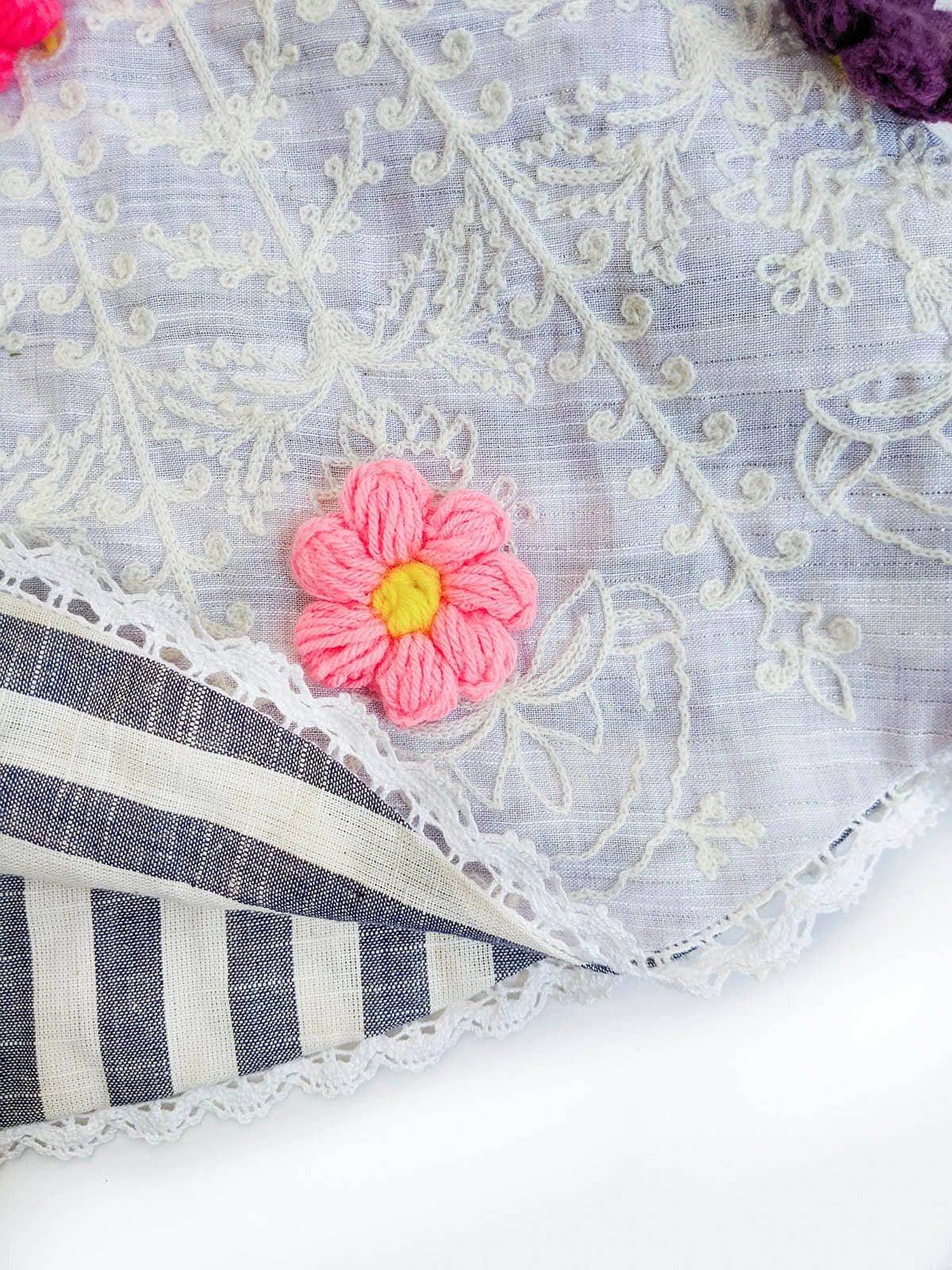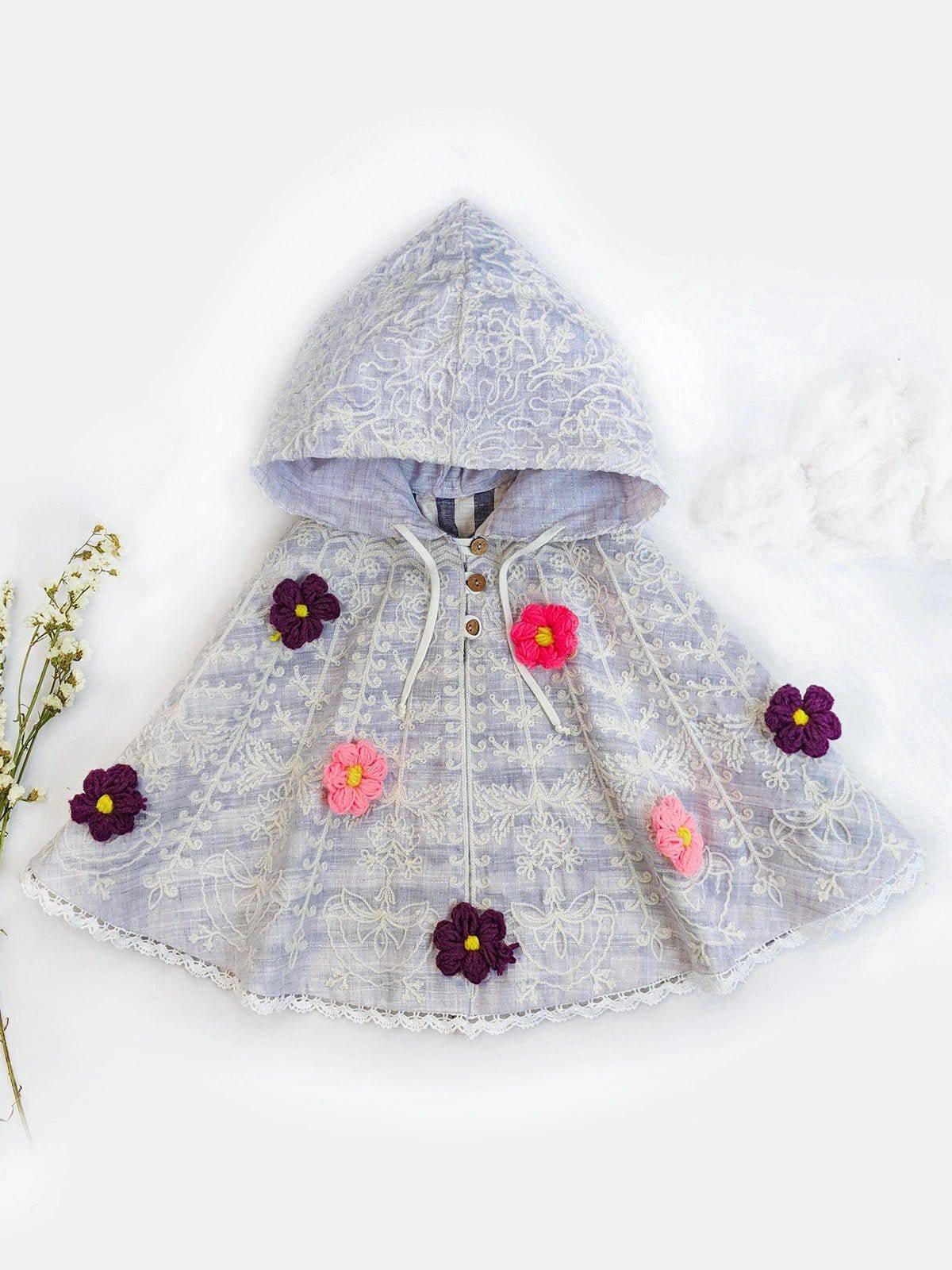 The woolen handmade flowers pops with a hooded cap, makes it truly one-of-a-kind.