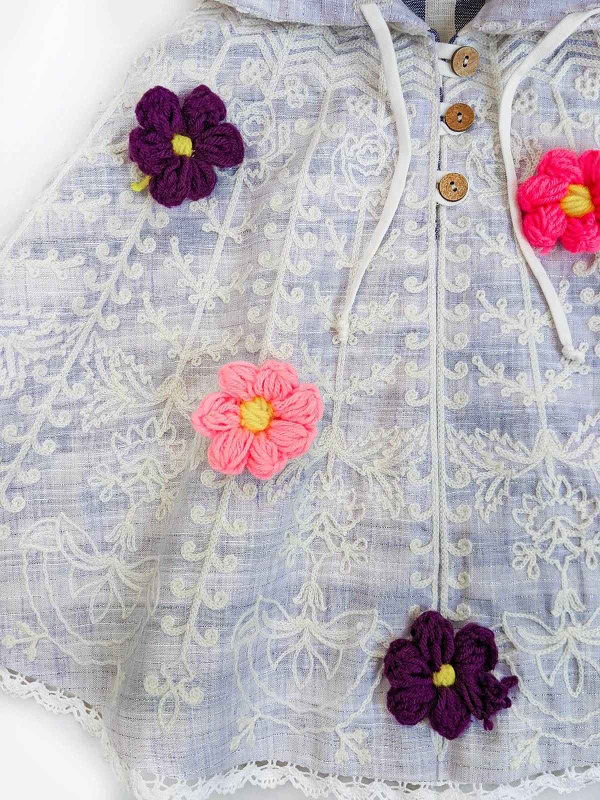 Purple Spring Flower Embroidered Picnic Poncho Top For Girls