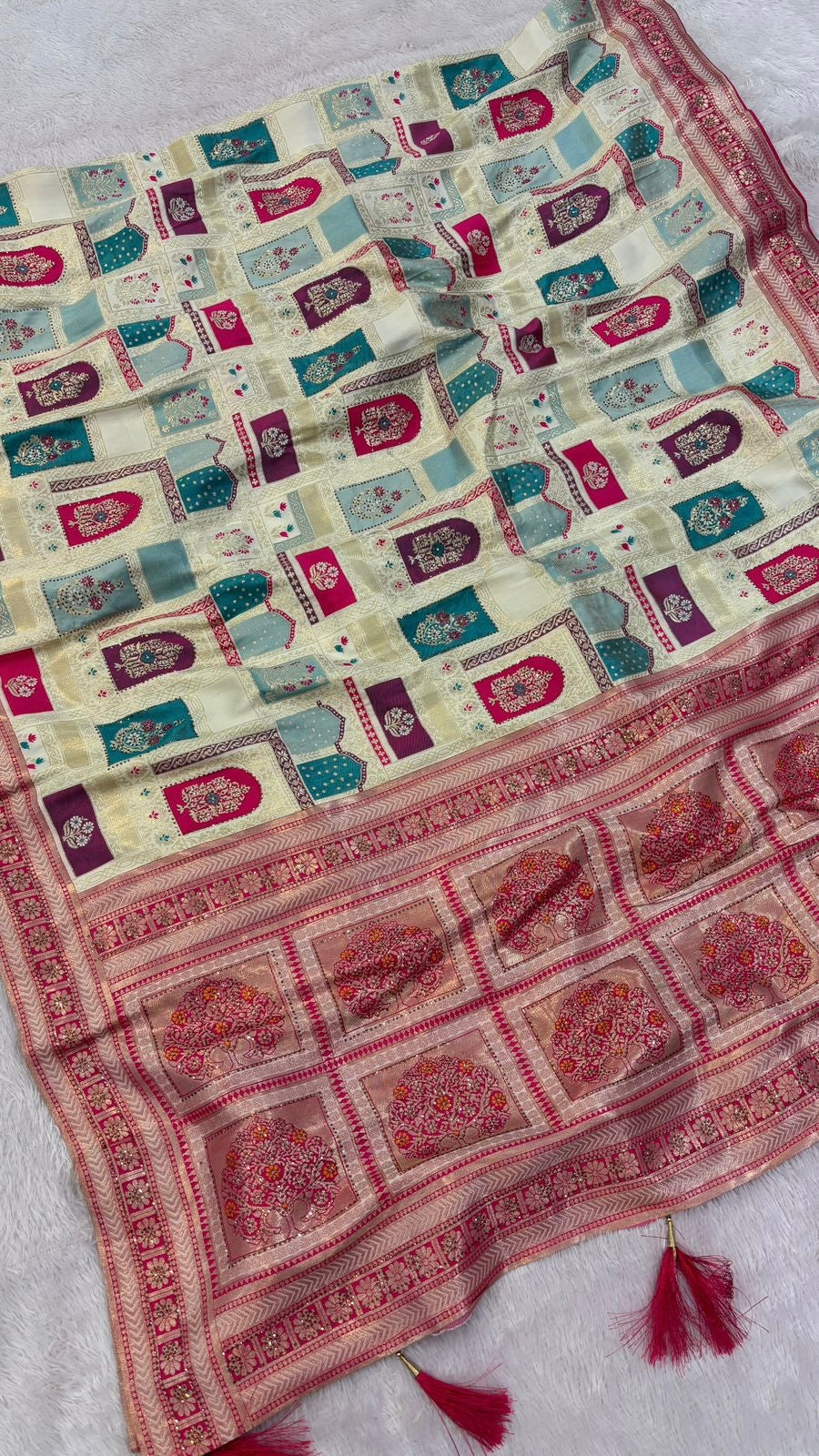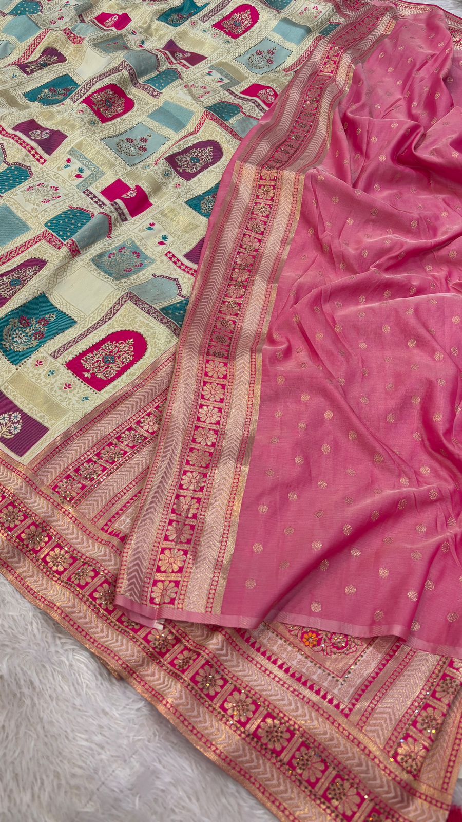 Get ready to dazzle in our Heavy Dola silk saree, meticulously crafted with Zarkandi work. Order now and elevate your style with elegance and grace.