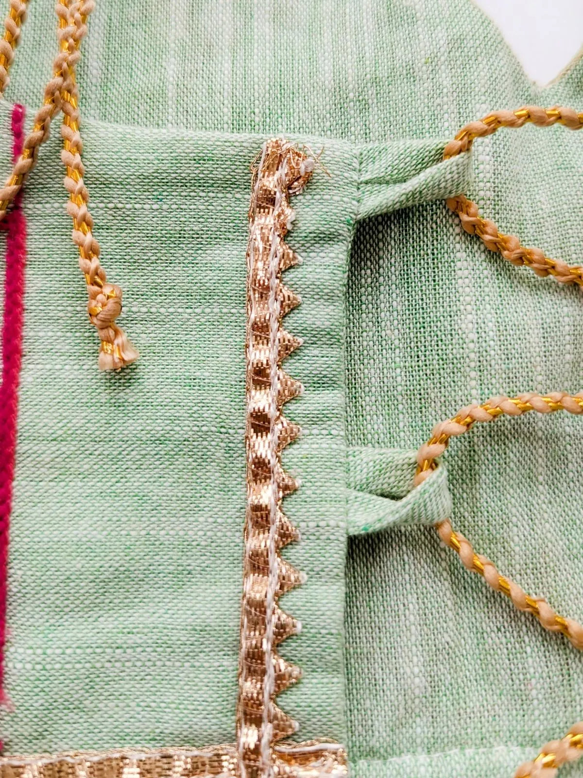 Blouse- Rich thread embroidered Pista halter neck blouse is one of the most comfortable styles. It is adjustable from back making it super easy to wear. Dazzling Kodi laces surrounds the edges. It has self soft liner Inside.