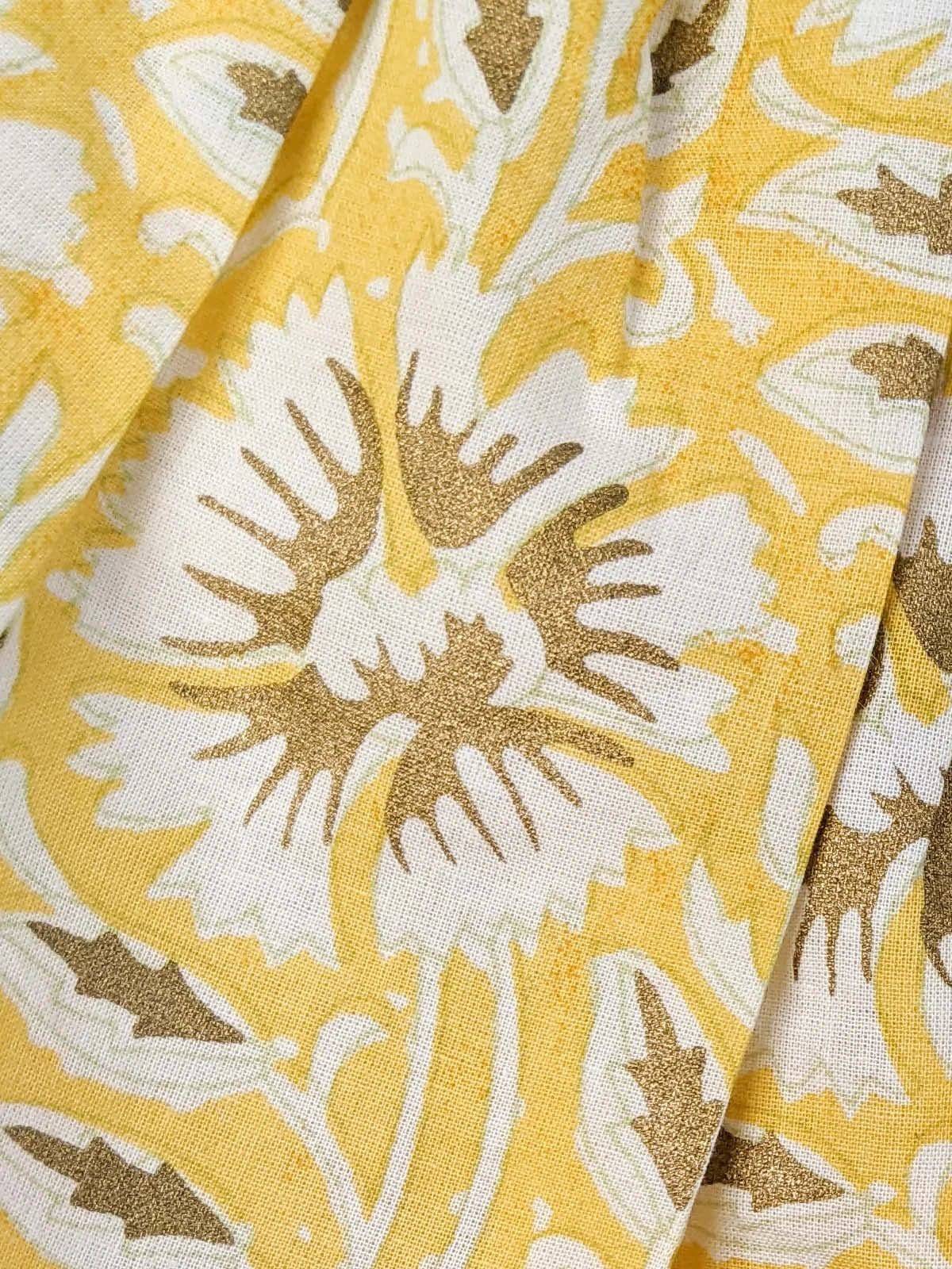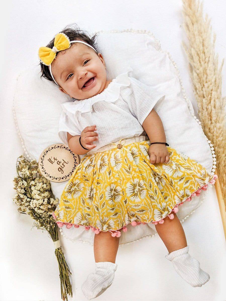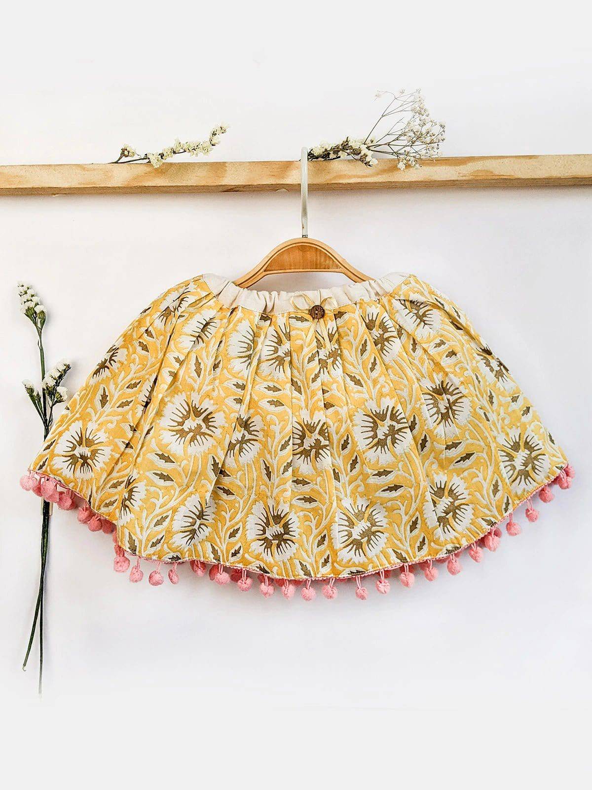 Fresh yellow 100% cotton printed mini skirt for your tiny little girl is a super comfy outfit to try on. Elasticated waist belt for easy wearing and comfort, super soft fabric, durable and trendy. There is an attached bloomer with the skirt for extra safety for girls. Peach poppy pompom attached.