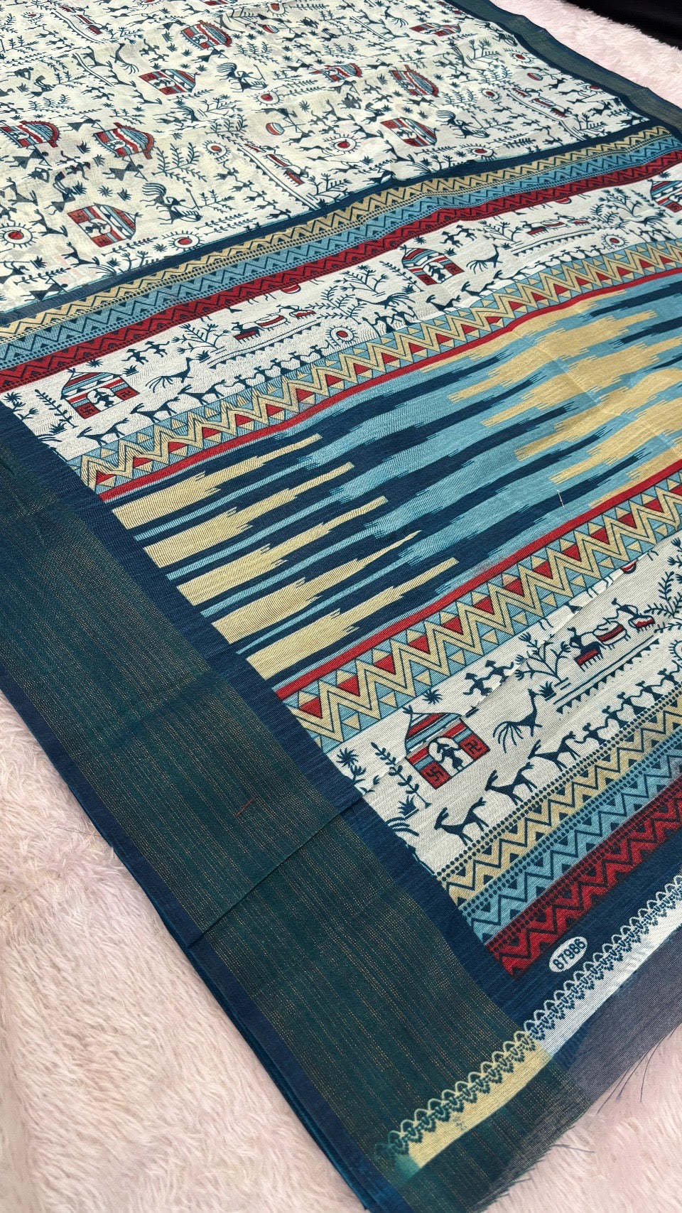 SUMMER SALE Warli Print Cotten Saree (Rama)