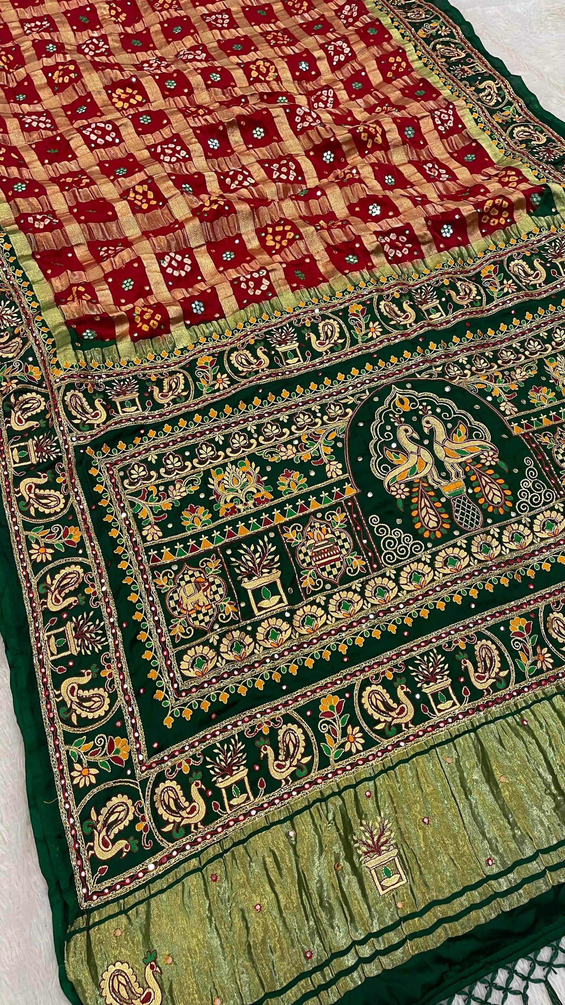 Intricate Handwork Detailing: Adorned with 100% handwork, the Bhatiya Chex Gharchola design showcases meticulous craftsmanship, adding a touch of uniqueness and cultural significance to every piece.