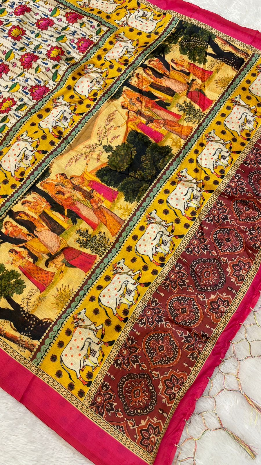 A Tusser silk Kalamkari saree elegantly combines the richness of Tusser silk with the intricate, hand-painted artistry of Kalamkari designs.
