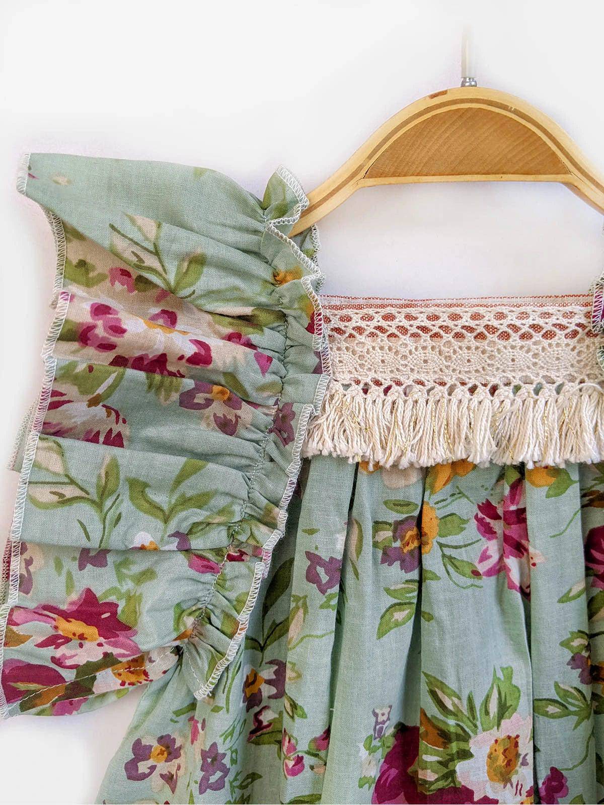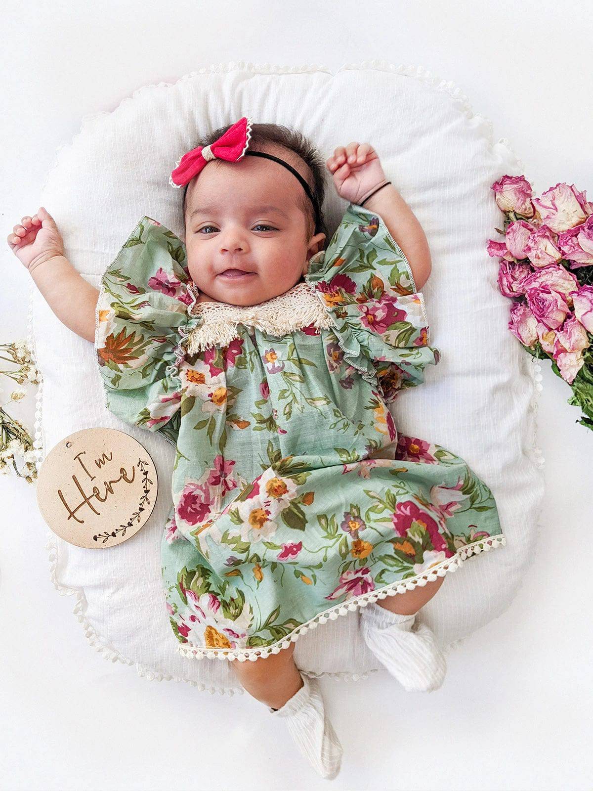 Victoria Pleated Floral Frilly Teal Baby Girl Dress