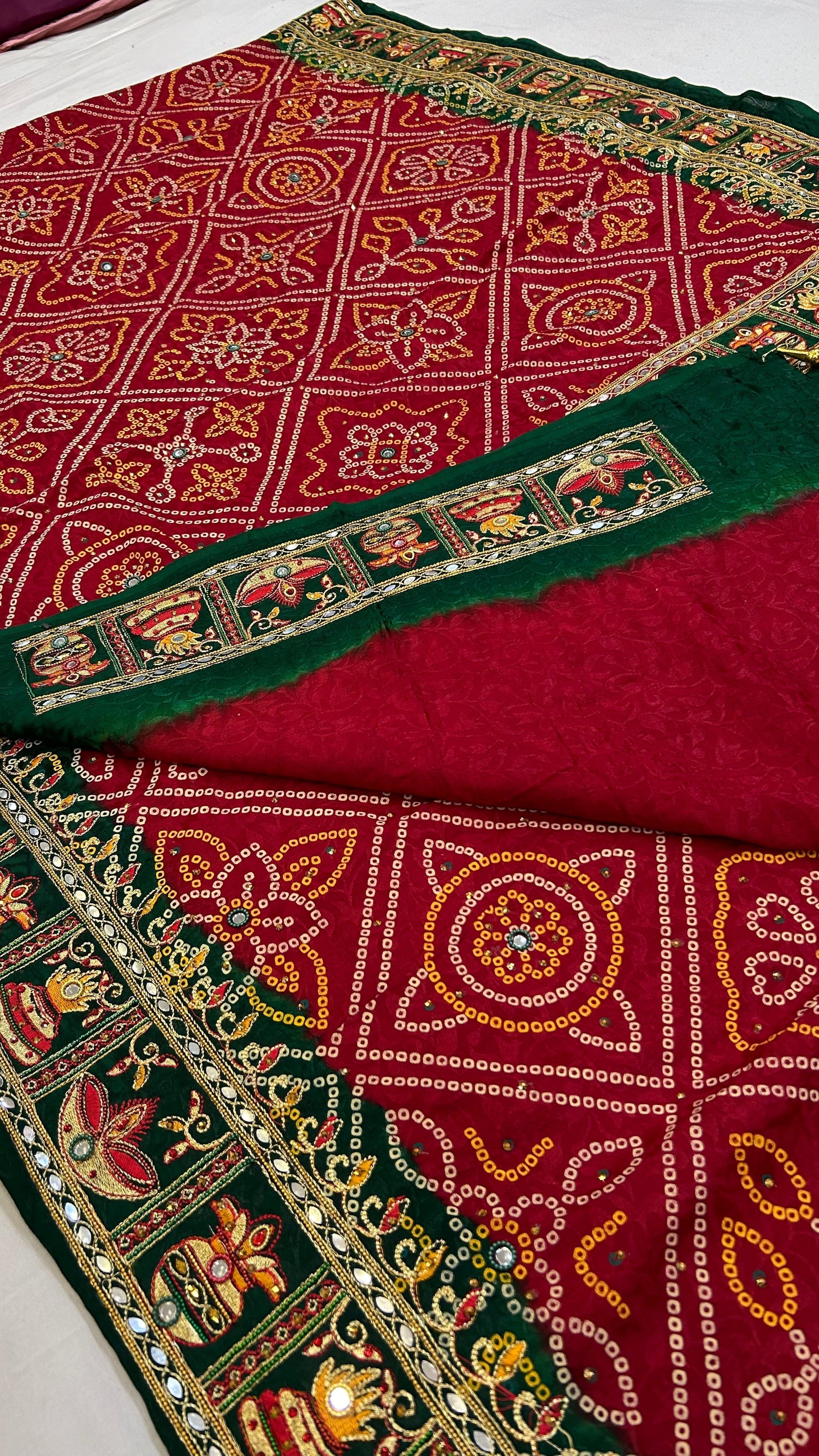 Intricate Embroidery Work: Adorned with meticulous embroidery, the Gharchola design reflects a rich tapestry of cultural heritage, showcasing the skilled craftsmanship that goes into each piece.