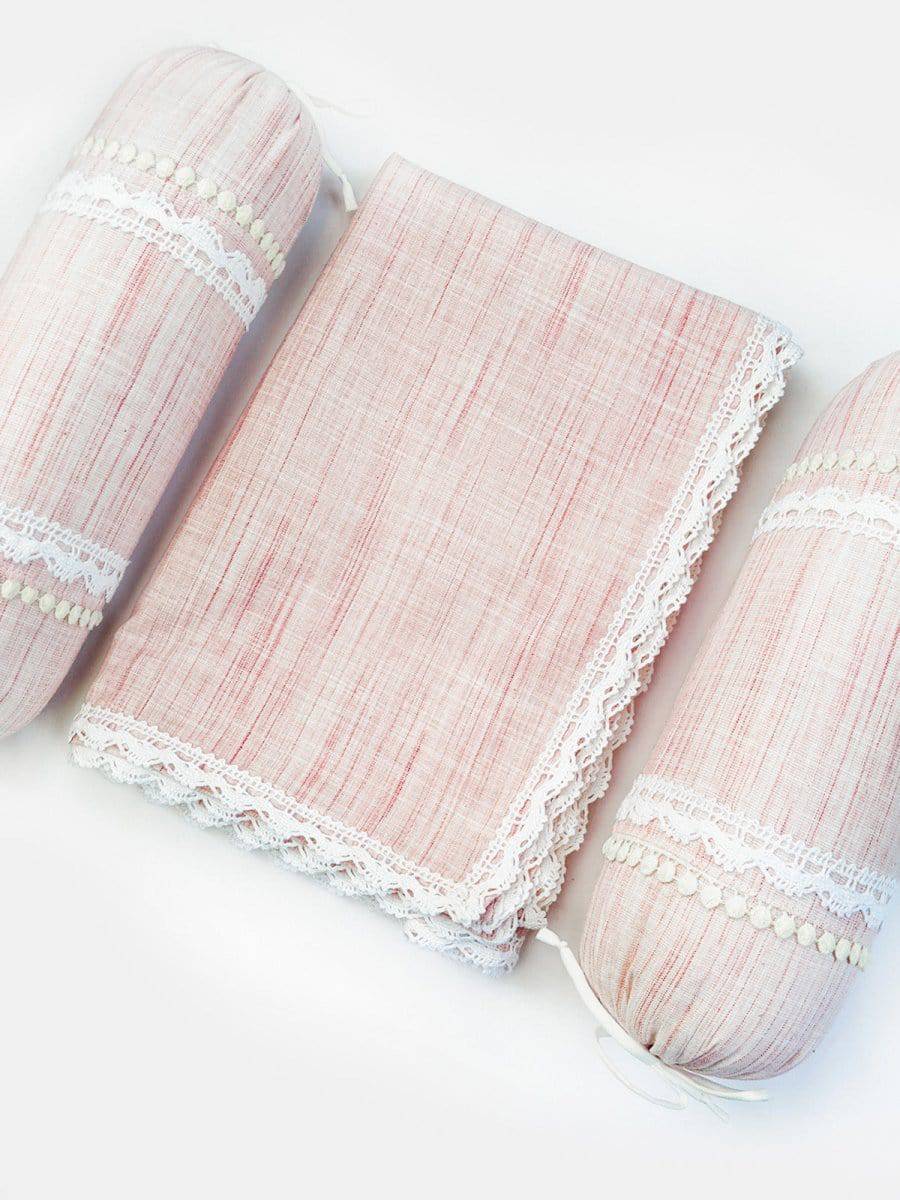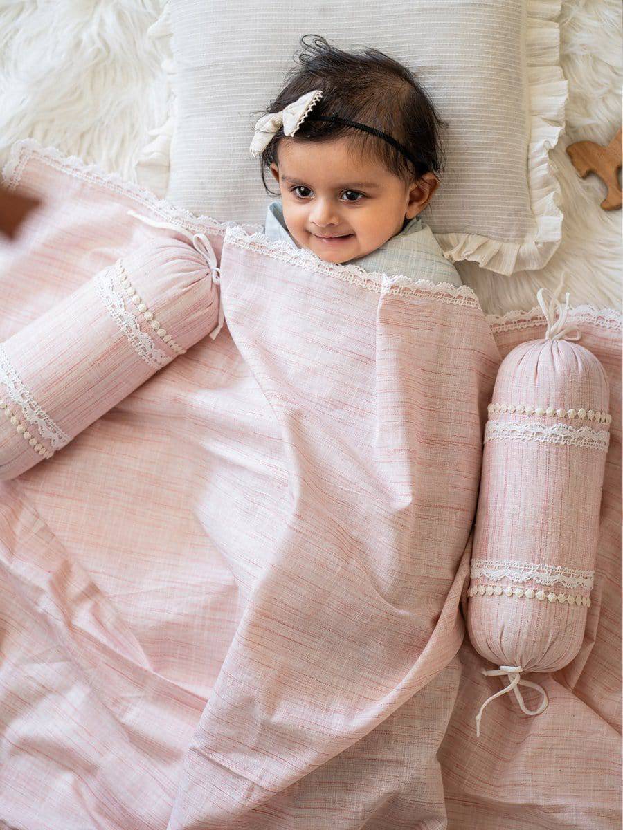 Soft and luxurious bolster are made using traditional method and cotton that set helps to support babies while they are sleeping and also helps to avoid incorrect sleeping postures. Blankets is also made from same washed fabric fenced with a pure cotton lace. They featuring an adorable boho vibe that will add chic style to your little one's nursery. The soft cotton lace is attractive and ads luxury.