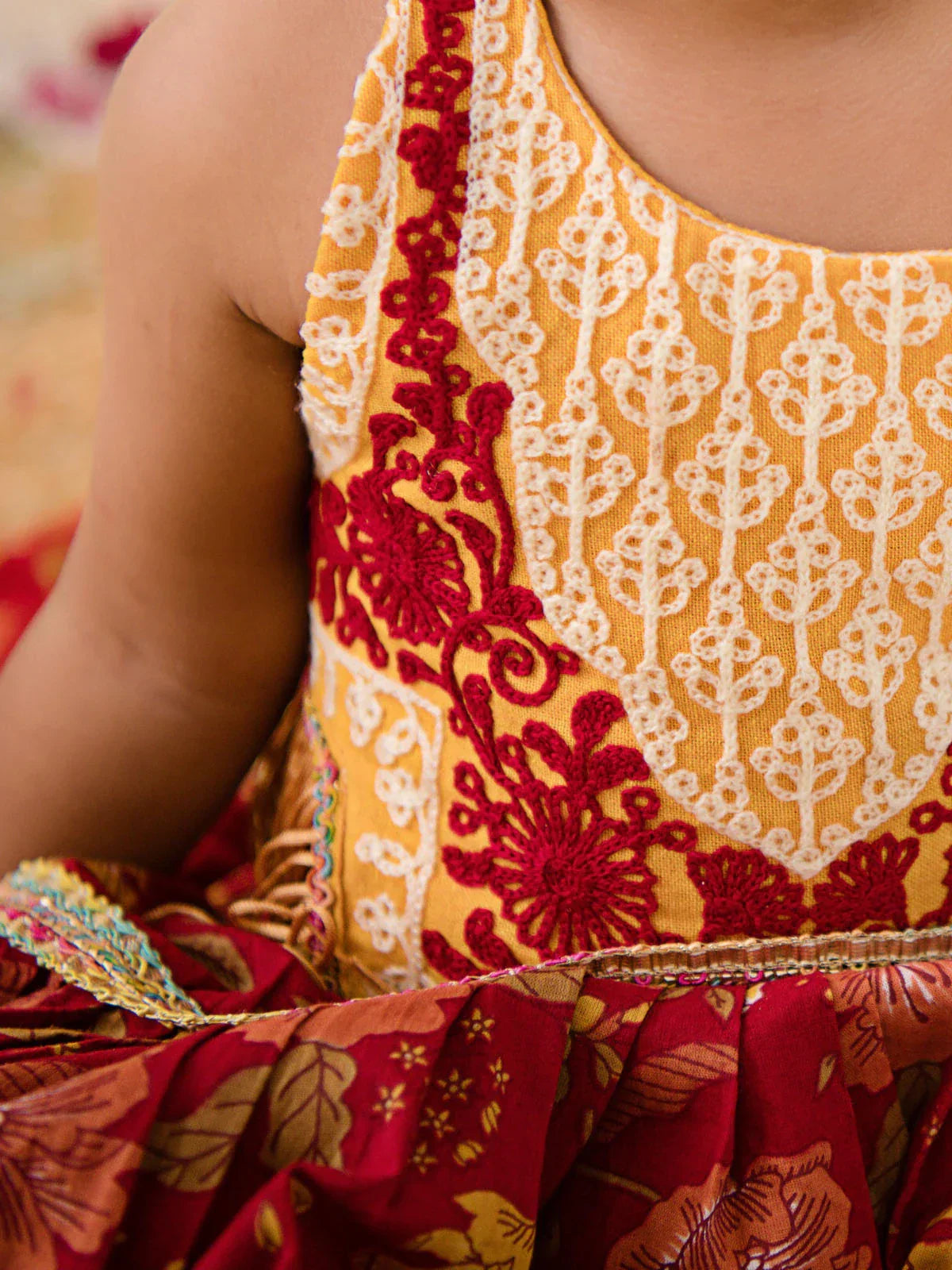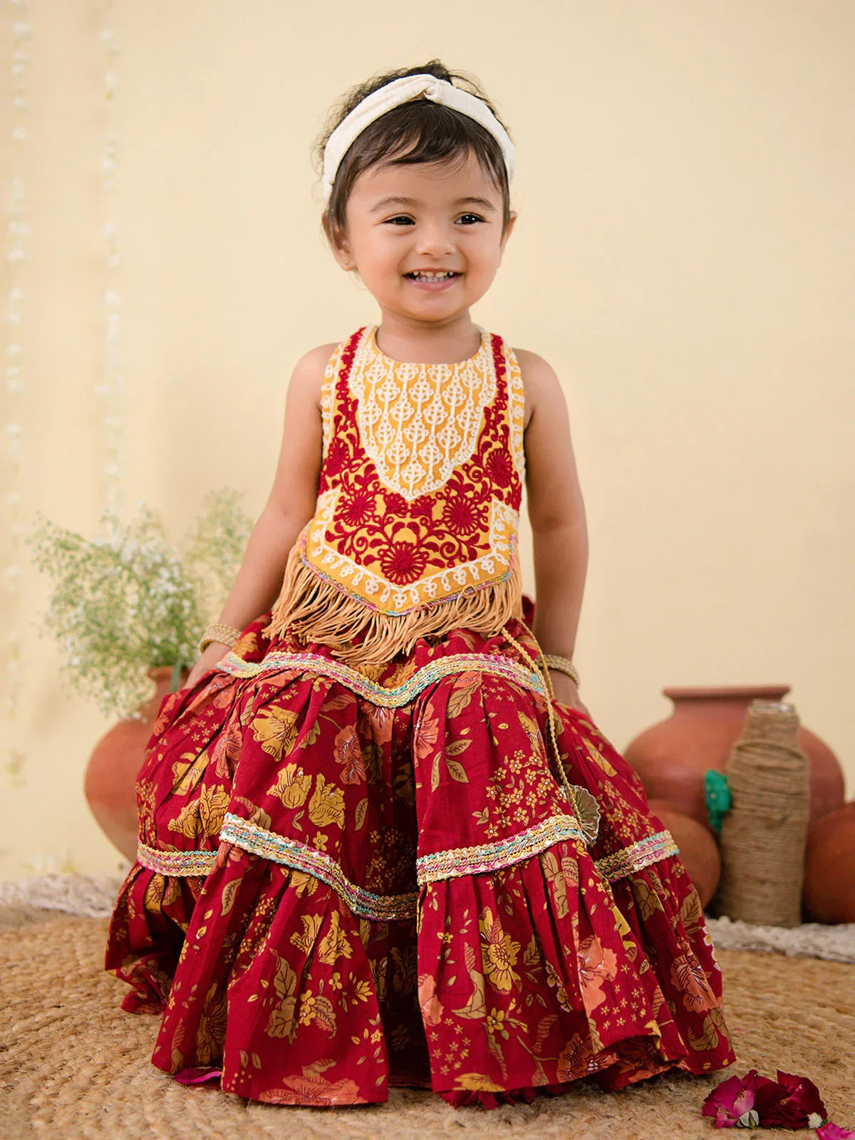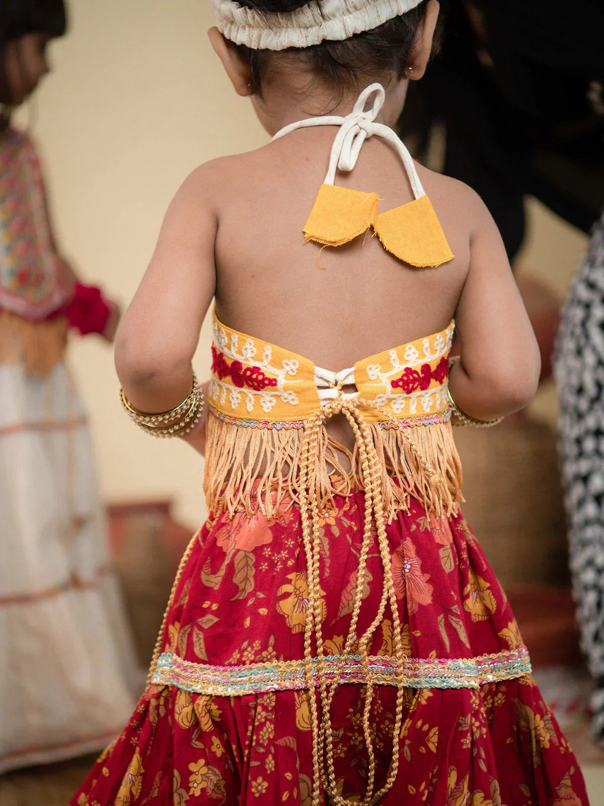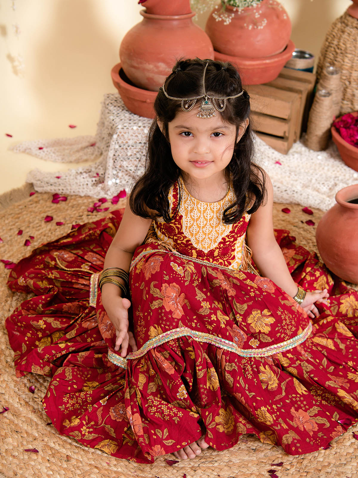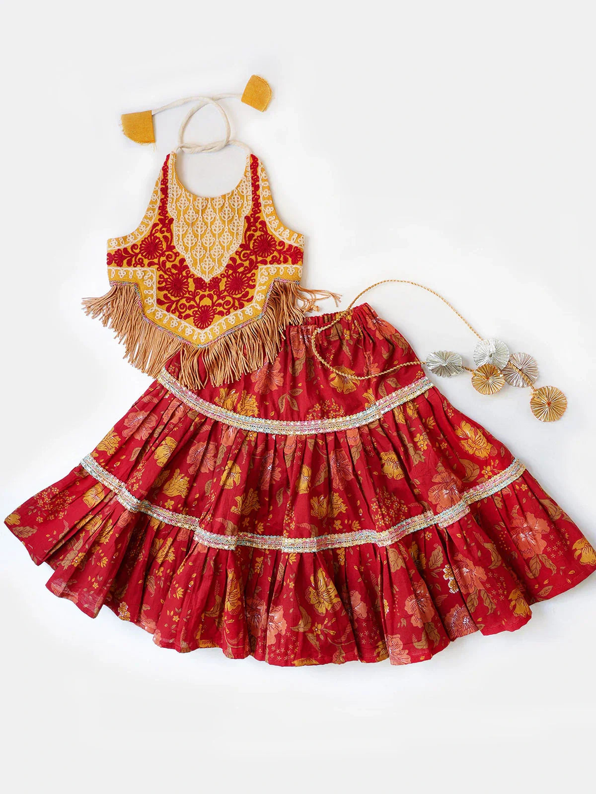 Lehenga- Three-tier pleated lehenga is fully flared with tiny baby safe lace. Skirts have comfortable elastic on waist for easy wearing and fittings.
