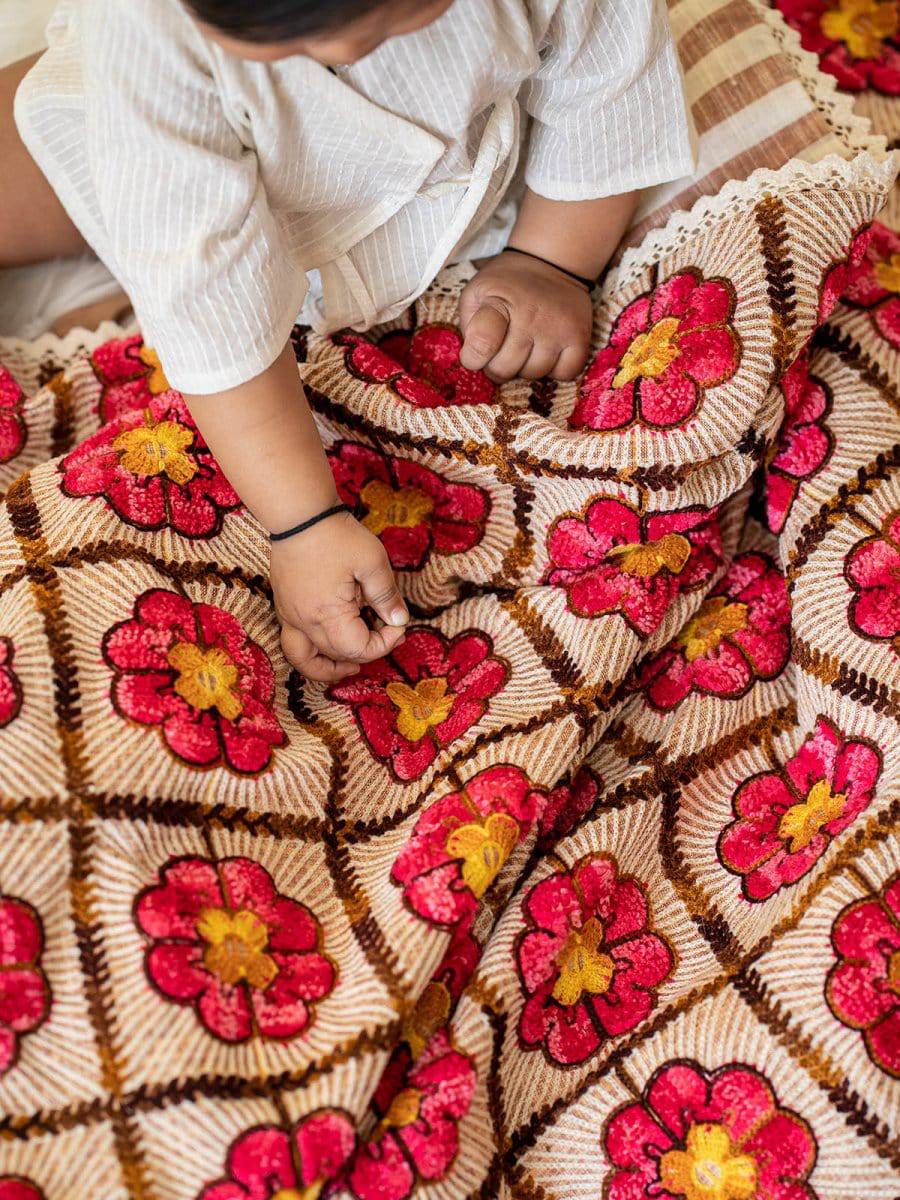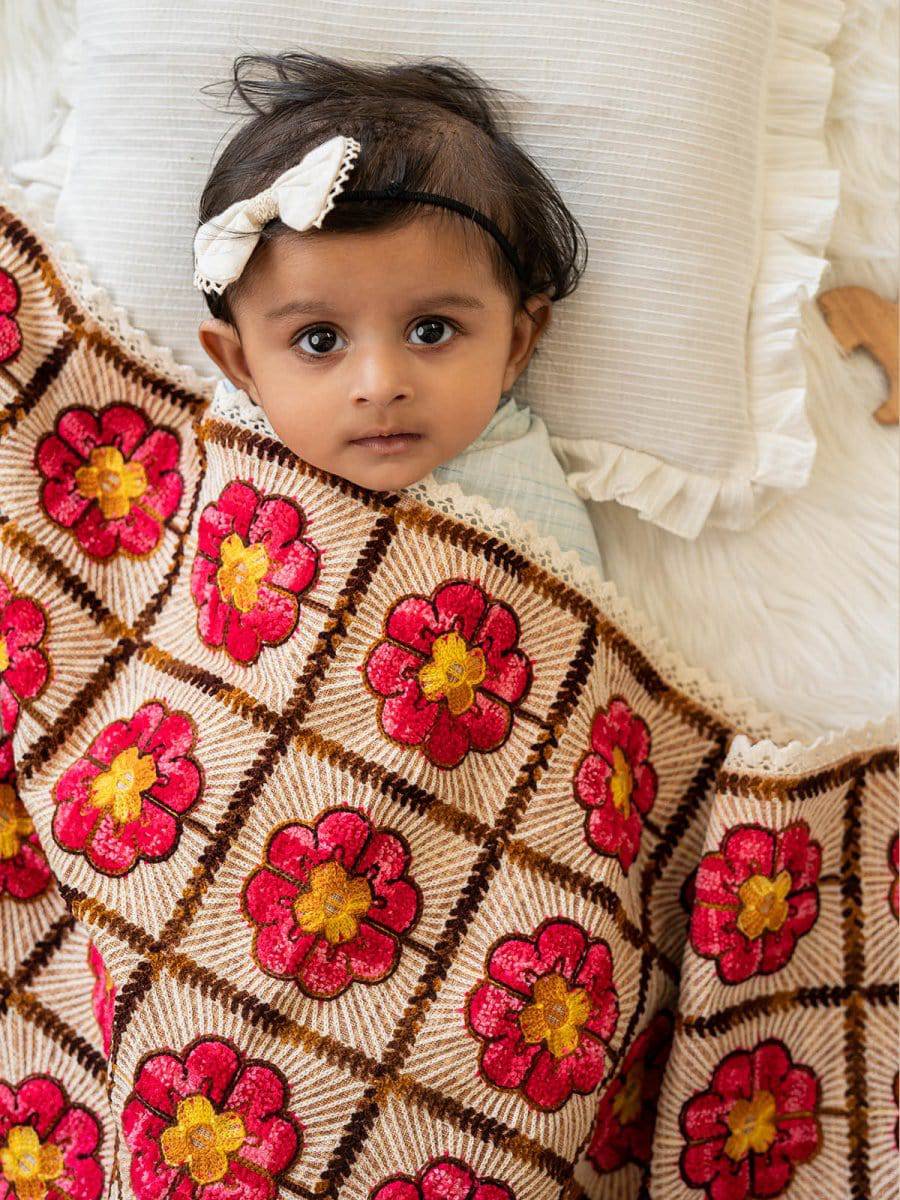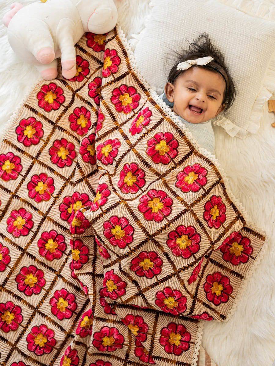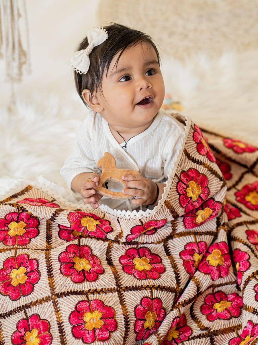 Offering Luxury, Style and Comfort. Blankets are the must have newborn and kids accessory. This Beautiful blanket is heavily embroidered with Woolen roses. Fenced with chennile zigzag lace. These blankets can be used to cover up babies during winters (0-7 yrs), travelling and Luxury bed/play spreads making the most comfortable environment for them.