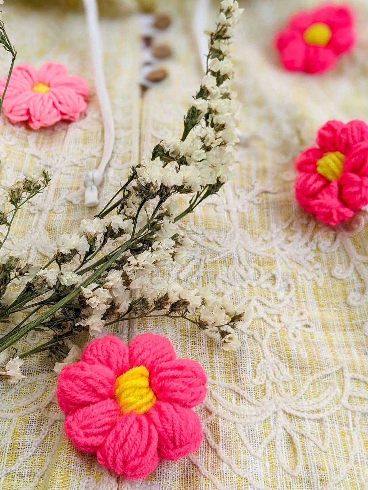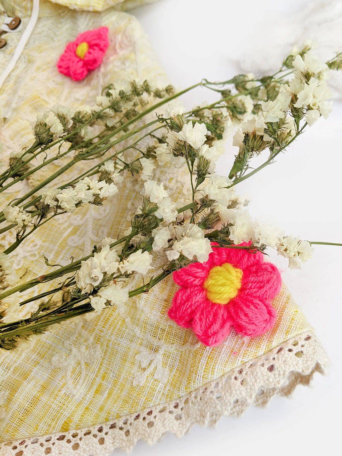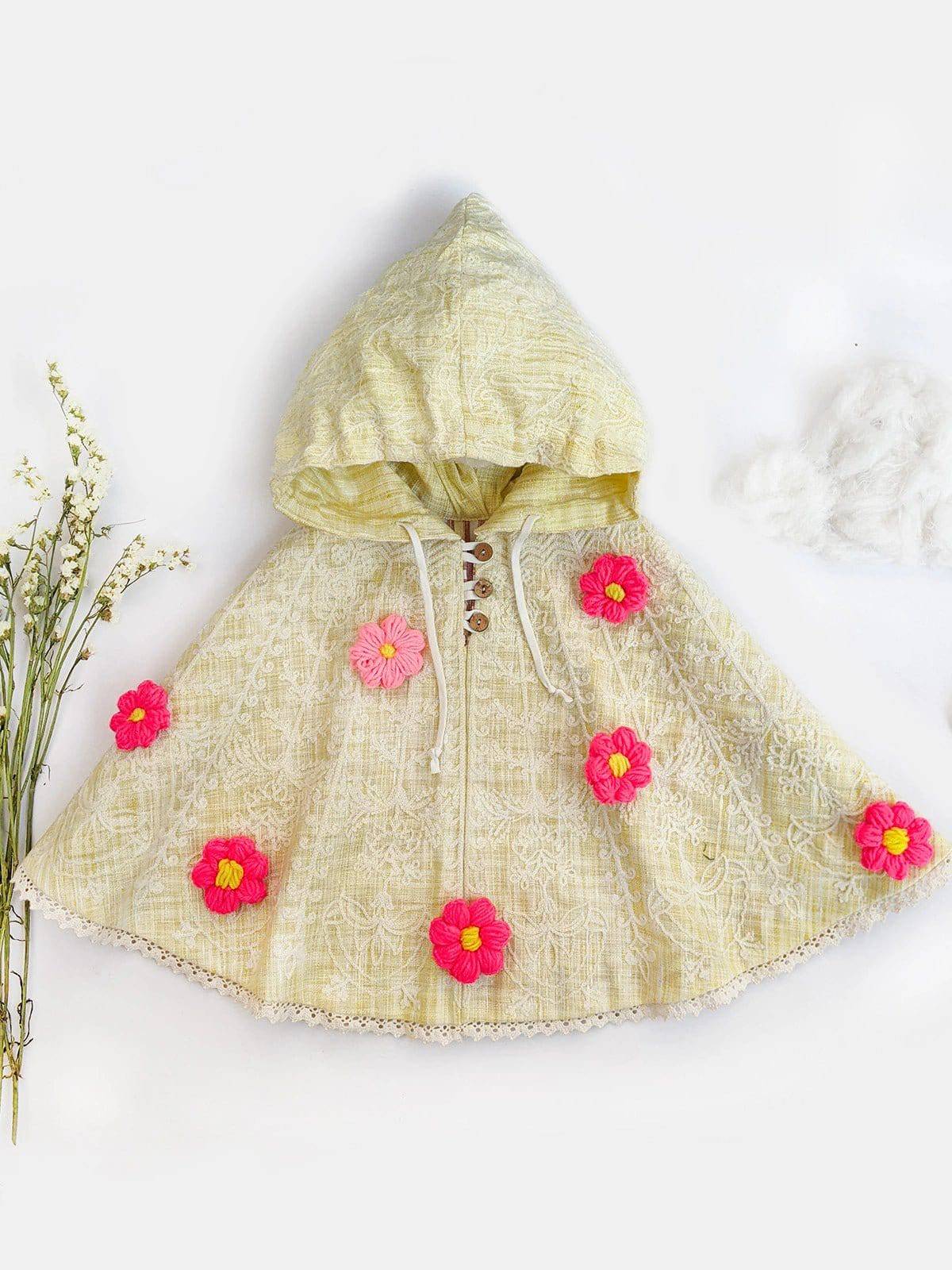 The woolen handmade flowers pops with a hooded cap, makes it truly one-of-a-kind.