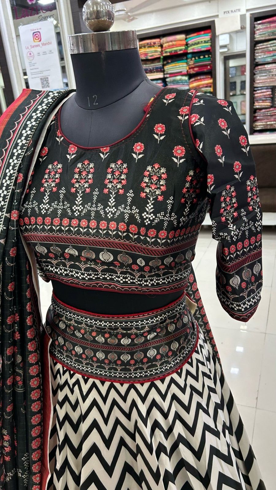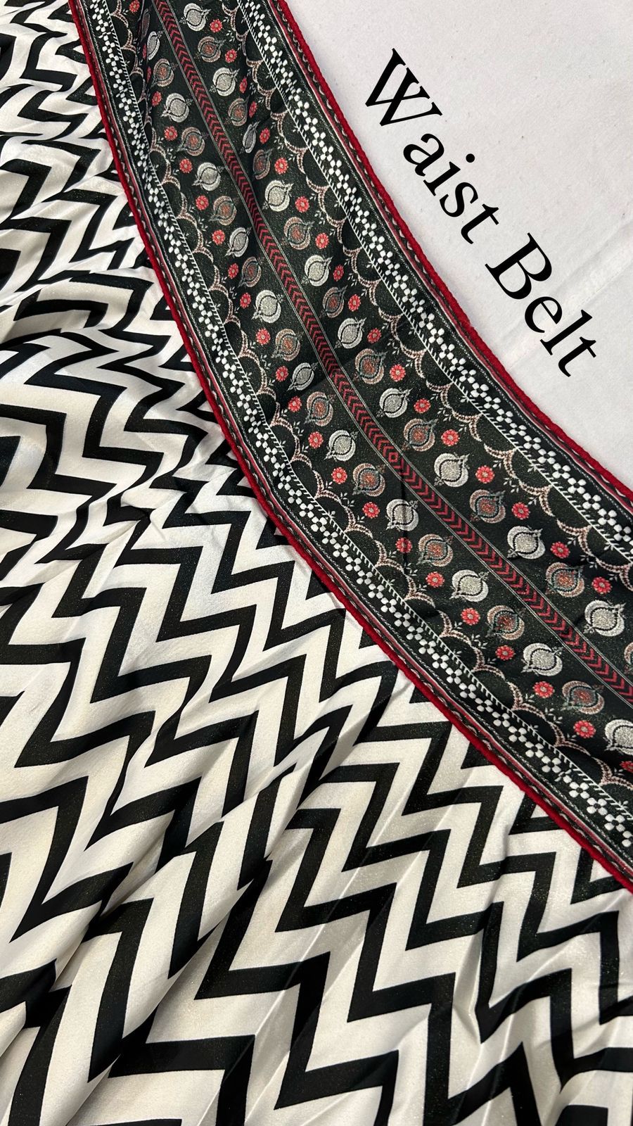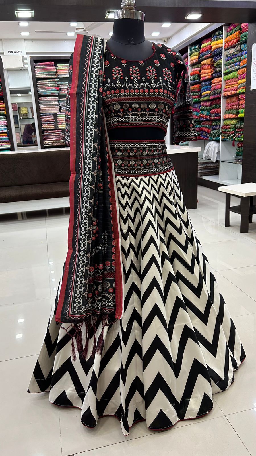 This Lehanga Choli is a celebration of extravagance and versatility. From its generous flair to the modern zigzag design and the convenience of a ready-made blouse, it's crafted to make the wearer stand out and exude elegance at every turn.
